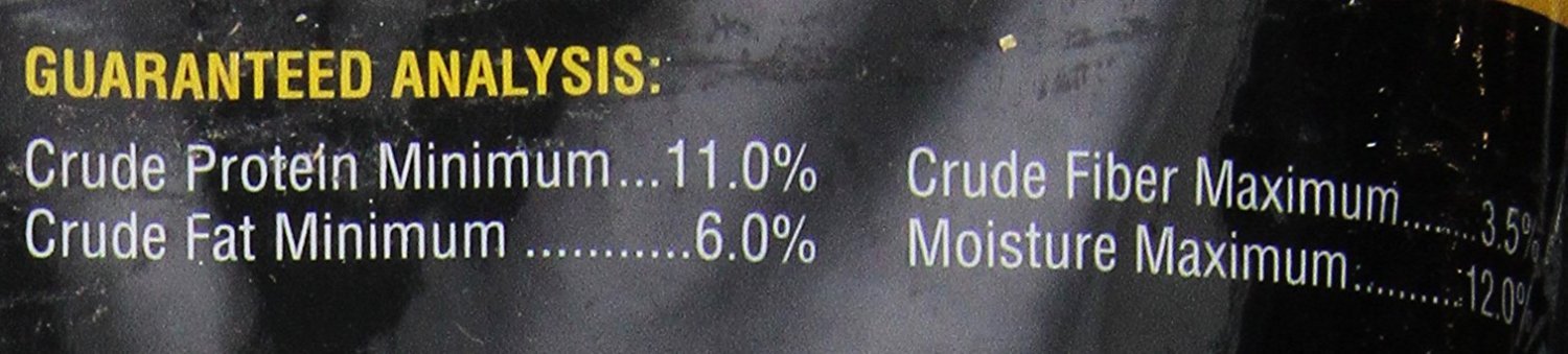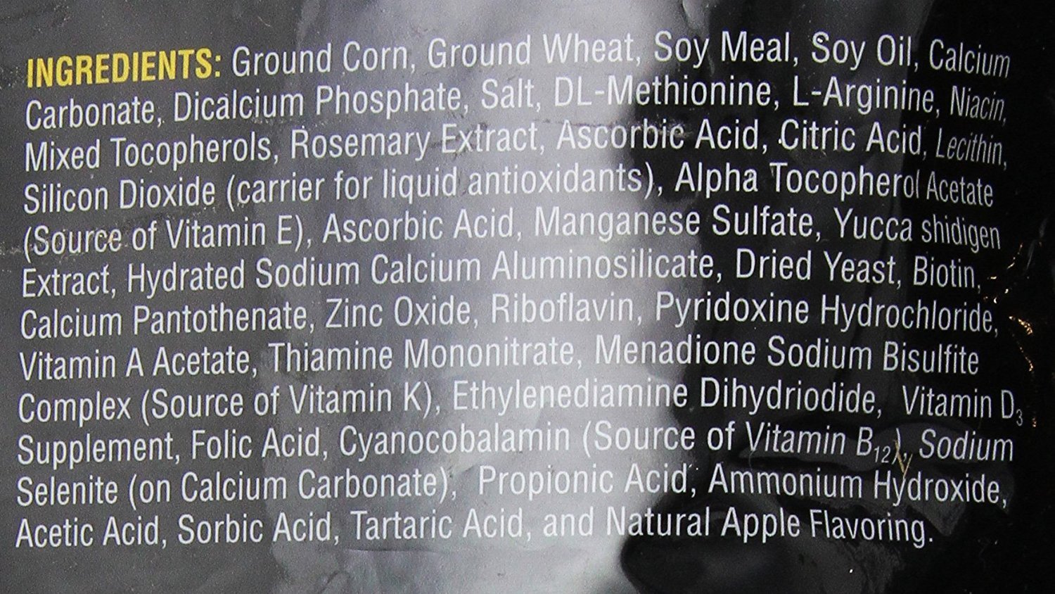 | ingredients | Ground Corn, Ground Wheat, Soybean Meal, Soybean Oil, Alfalfa, Calcium Carbonate, Dicalcium Phosphate, Salt, L-Lysine, DL-Methionine, L-Arginine, Niacin, Silicon Dioxide (anti-caking aid), Citric Acid (Preservative), Mixed Tocopherols (Preservative), Vegetable Oil, Rosemary Extract, Alpha Tocopherol Acetate (Source of Vitamin E), Ascorbic Acid, Manganese Sulfate, Yucca schidigera Extract, Dried Yeast, Biotin, Calcium Pantothenate, Zinc Oxide, Riboflavin, Pyridoxine Hydrochloride, Vitamin A Acetate, Thiamine Mononitrate, Potassium Iodide, Vitamin D3 Supplement, Folic Acid, Vitamin B12 Supplement, Sodium Selenite, Propionic Acid (Preservative), Ammonium Hydroxide, Acetic Acid, Sorbic Acid (Preservative), Tartaric Acid, and Natural Apple Flavoring |