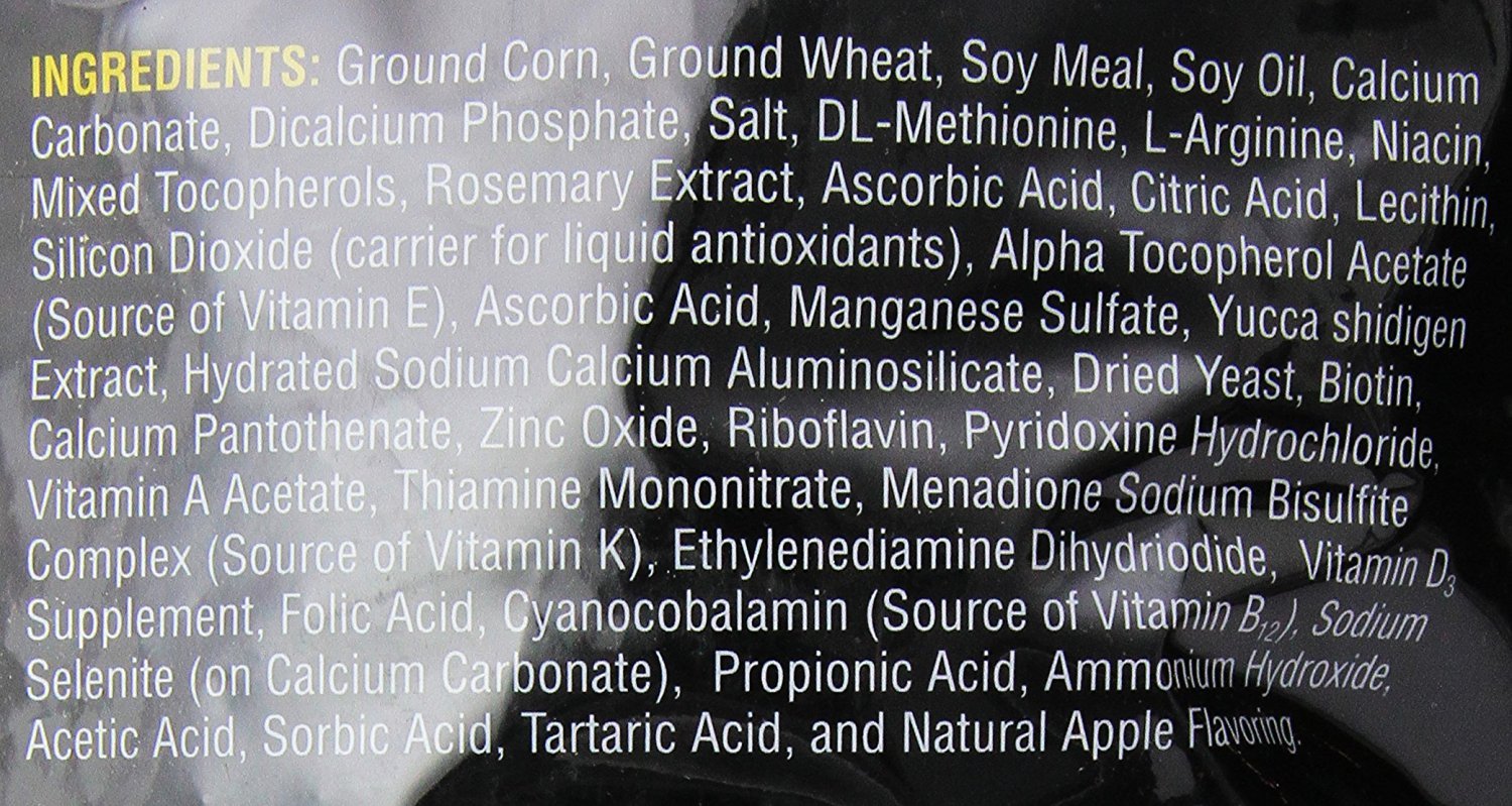 | ingredients | Ground Corn, Ground Wheat, Soybean Meal, Soybean Oil, Alfalfa, Calcium Carbonate, Dicalcium Phosphate, Salt, L-Lysine, DL-Methionine, L-Arginine, Niacin, Silicon Dioxide (anti-caking aid), Citric Acid (Preservative), Mixed Tocopherols (Preservative), Vegetable Oil, Rosemary Extract, Alpha Tocopherol Acetate (Source of Vitamin E), Ascorbic Acid, Manganese Sulfate, Yucca schidigera Extract, Dried Yeast, Biotin, Calcium Pantothenate, Zinc Oxide, Riboflavin, Pyridoxine Hydrochloride, Vitamin A Acetate, Thiamine Mononitrate, Potassium Iodide, Vitamin D3 Supplement, Folic Acid, Vitamin B12 Supplement, Sodium Selenite, Propionic Acid (Preservative), Ammonium Hydroxide, Acetic Acid, Sorbic Acid (Preservative), Tartaric Acid, and Natural Apple Flavoring |
