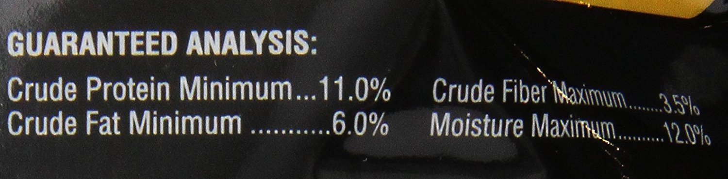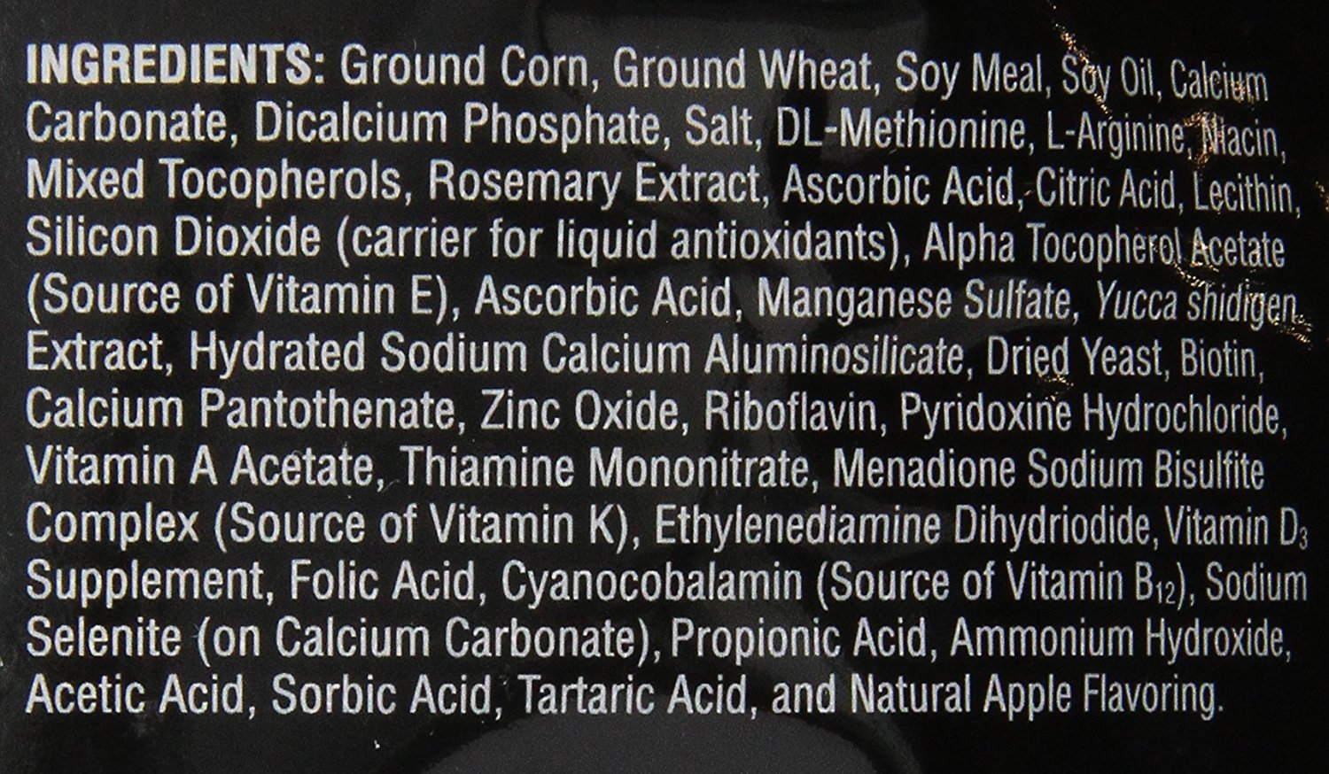 | ingredients | Ingredients: Ground Corn, Ground Wheat, Soybean Meal, Soybean Oil, Calcium Carbonate, Dicalcium Phosphate, Salt, DL-Methionine, L-Arginine, Niacin, Mixed Tocopherols (Preservative), Silicon Dioxide (Anti-Caking Aid), Rapeseed Oil, Citric Acid (Preservative), Lecithin, Rosemary Extract, Alpha Tocopherol Acetate (Source Of Vitamin E), Ascorbic Acid, Manganese Sulfate, Yucca Schidigera Extract, Hydrated Sodium Calcium Aluminosilicate, Dried Yeast, Biotin, Calcium Pantothenate, Zinc Oxide, Pyridoxine Hydrochloride, Vitamin A Acetate, Thiamine Mononitrate, Menadione Sodium Bisulfite Complex (Source of Vitamin K), Ethylenediamine Dihydriodide, Vitamin D3 Supplement, Folic Acid, Cyanocobalamin (Source of Vitamin B12), Sodium Selenite, Propionic Acid (Preservative), Ammonium Hydroxide, Acetic Acid, Sorbic Acid, Tartaric Acid, and Natural Apple Flavoring. |