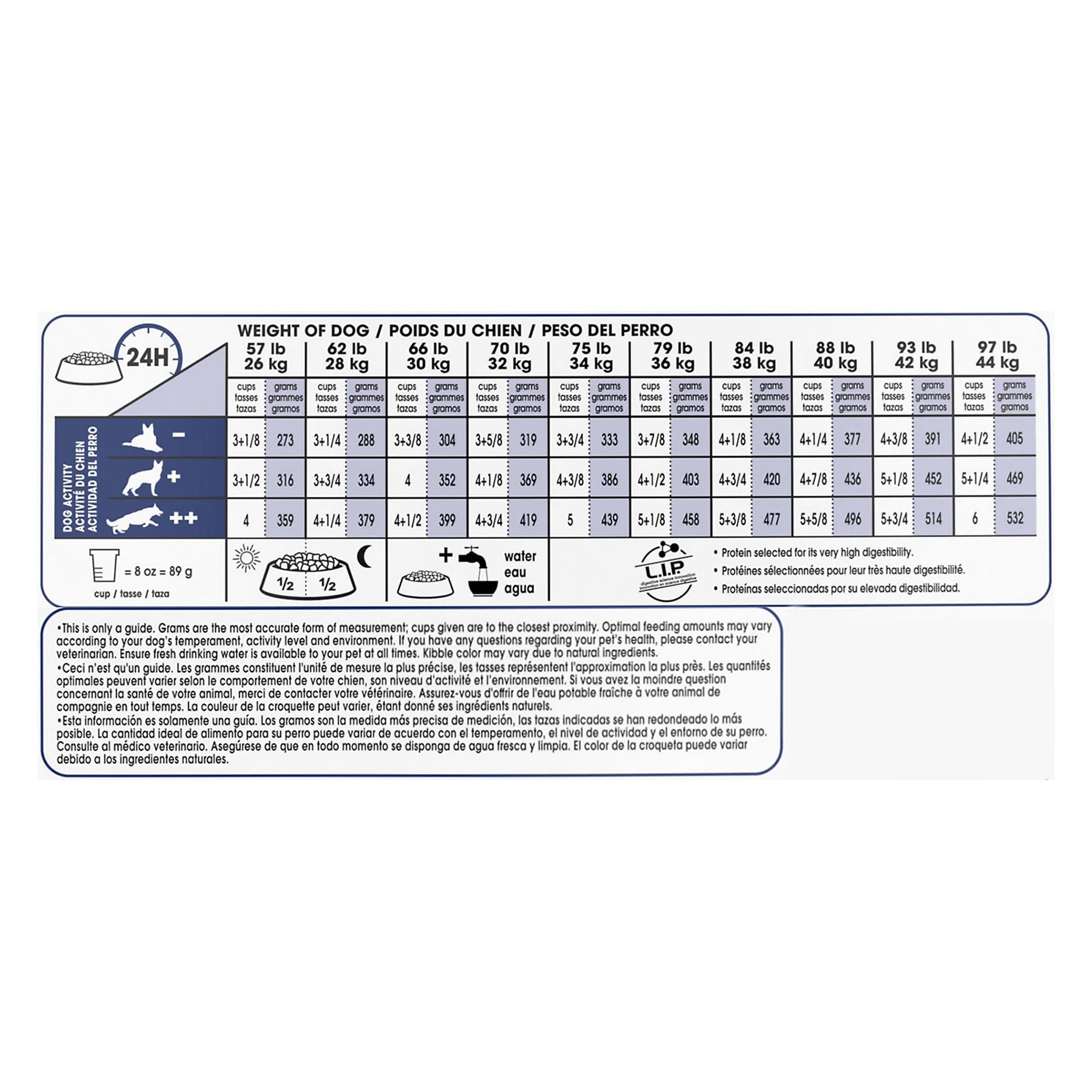 | directions | Weight Low Activity Medium Activity High Activity 57.3 lb (26 kg) 3 1/8 Cups (273 g) 3 1/2 Cups (316 g) 4 Cups (359 g) 61.7 lb (28 kg) 3 1/4 Cups (288 g) 3 3/4 Cups (334 g) 4 1/4 Cups (379 g) 66.1 lb (30 kg) 3 3/8 Cups (304 g) 4 Cups (352 g) 4 1/2 Cups (399 g) 70.5 lb (32 kg) 3 5/8 Cups (319 g) 4 1/8 Cups (369 g) 4 3/4 Cups (419 g) 75 lb (34 kg) 3 3/4 Cups (333 g) 4 3/8 Cups (386 g) 5 Cups (439 g) 79.4 lb (36 kg) 3 7/8 Cups (348 g) 4 1/2 Cups (403 g) 5 1/8 Cups (458 g) 83.8 lb (38 kg) 4 1/8 Cups (363 g) 4 3/4 Cups (420 g) 5 3/8 Cups (477 g) 88.2 lb (40 kg) 4 1/4 Cups (377 g) 4 7/8 Cups (436 g) 5 5/8 Cups (496 g) 92.6 lb (42 kg) 4 3/8 Cups (391 g) 5 1/8 Cups (452 g) 5 3/4 Cups (514 g) 97 lb (44 kg) 4 1/2 Cups (405 g) 5 1/4 Cups (469 g) 6 Cups (532 g) |
