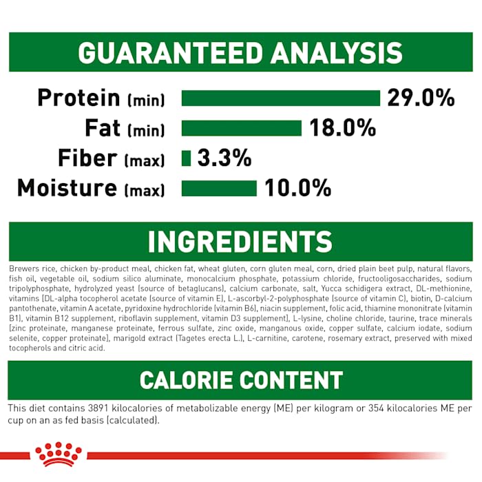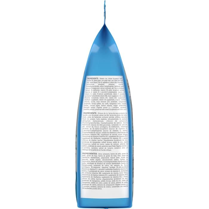 | ingredients | Brewers rice, chicken by-product meal, chicken fat, wheat gluten, corn gluten meal, corn, dried plain beet pulp, natural flavors, fish oil, vegetable oil, sodium silico aluminate, monocalcium phosphate, potassium chloride, fructooligosaccharides, sodium tripolyphosphate, hydrolyzed yeast (source of betaglucans), calcium carbonate, salt, Yucca schidigera extract, DL-methionine, vitamins DL-alpha tocopherol acetate (source of vitamin E), L-ascorbyl-2-polyphosphate (source of vitamin C), biotin, D-calcium pantothenate, vitamin A acetate, pyridoxine hydrochloride (vitamin B6), niacin supplement, folic acid, thiamine mononitrate (vitamin B1), vitamin B12 supplement, riboflavin supplement, vitamin D3 supplement, L-lysine, choline chloride, taurine, trace minerals zinc proteinate, manganese proteinate, ferrous sulfate, zinc oxide, manganous oxide, copper sulfate, calcium iodate, sodium selenite, copper proteinate, marigold extract (Tagetes erecta L.), L-carnitine, carotene, rosemary extract, preserved with mixed tocopherols and citric acid. |