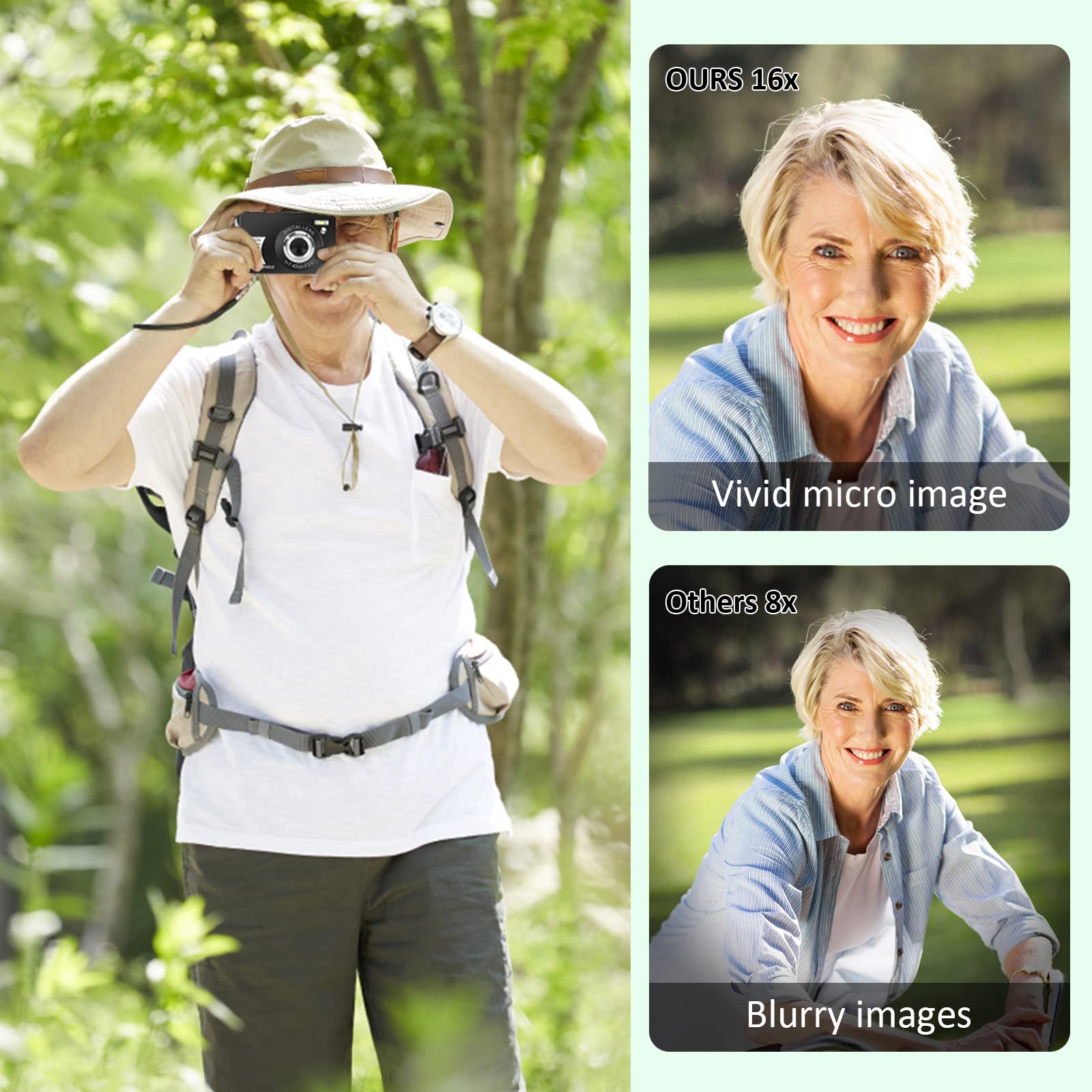 - 2.7K Digital Camera with 16X ZoomThe 2.7K video resolution and 16x digital zoom allow you to take panoramic photos or close-ups of the best quality. The camera is equipped with 2 rechargeable lithium-ion batteries, which can be replaced at any time, allowing you to take pictures without worrying about the power