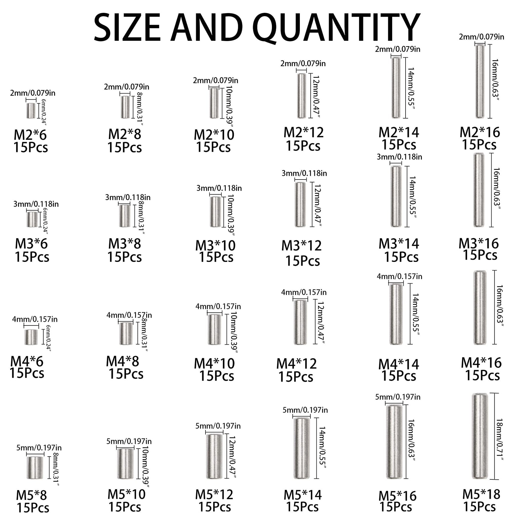 - PACKING QUANTITY: 360Pcs dowel pin 24 Sizes:M2(6/8/10/12/16mm), M3(6/8/10/12/16mm), M4(6/8/10/12/16mm), M5(8/10/12/16/18mm), 1Pcs clip.