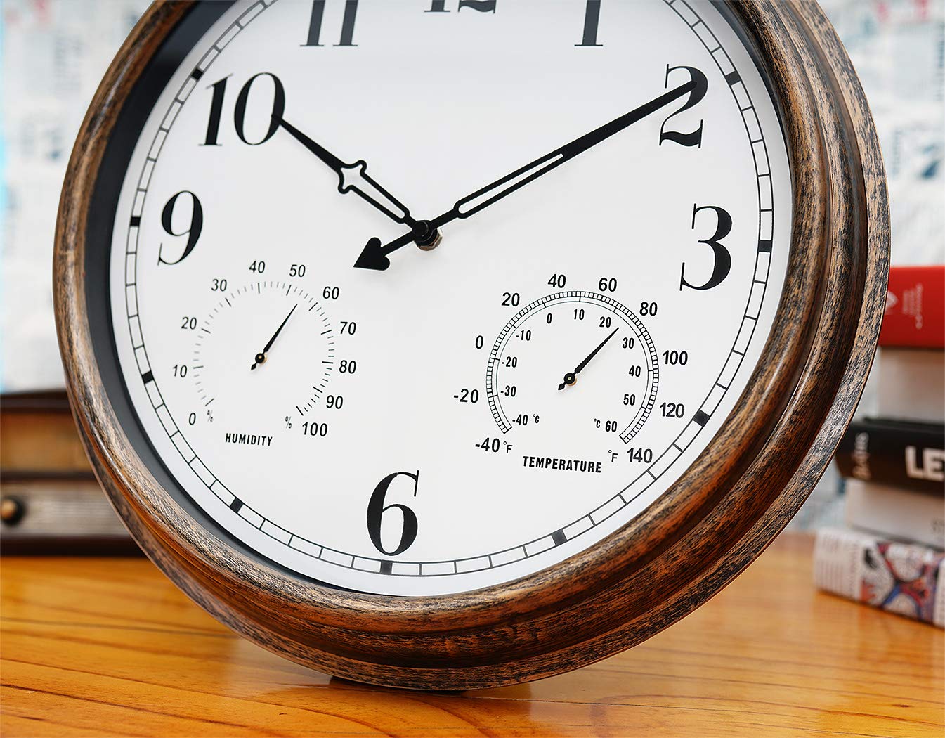 - Original Outdoor Clocks – 16 Inch Large Indoor Outdoor Wall Clock,Waterproof Non-Ticking Clock with Thermometer and Hygrometer Combo,Battery Operated Clock Wall Decorative-Bronze by Rsobl