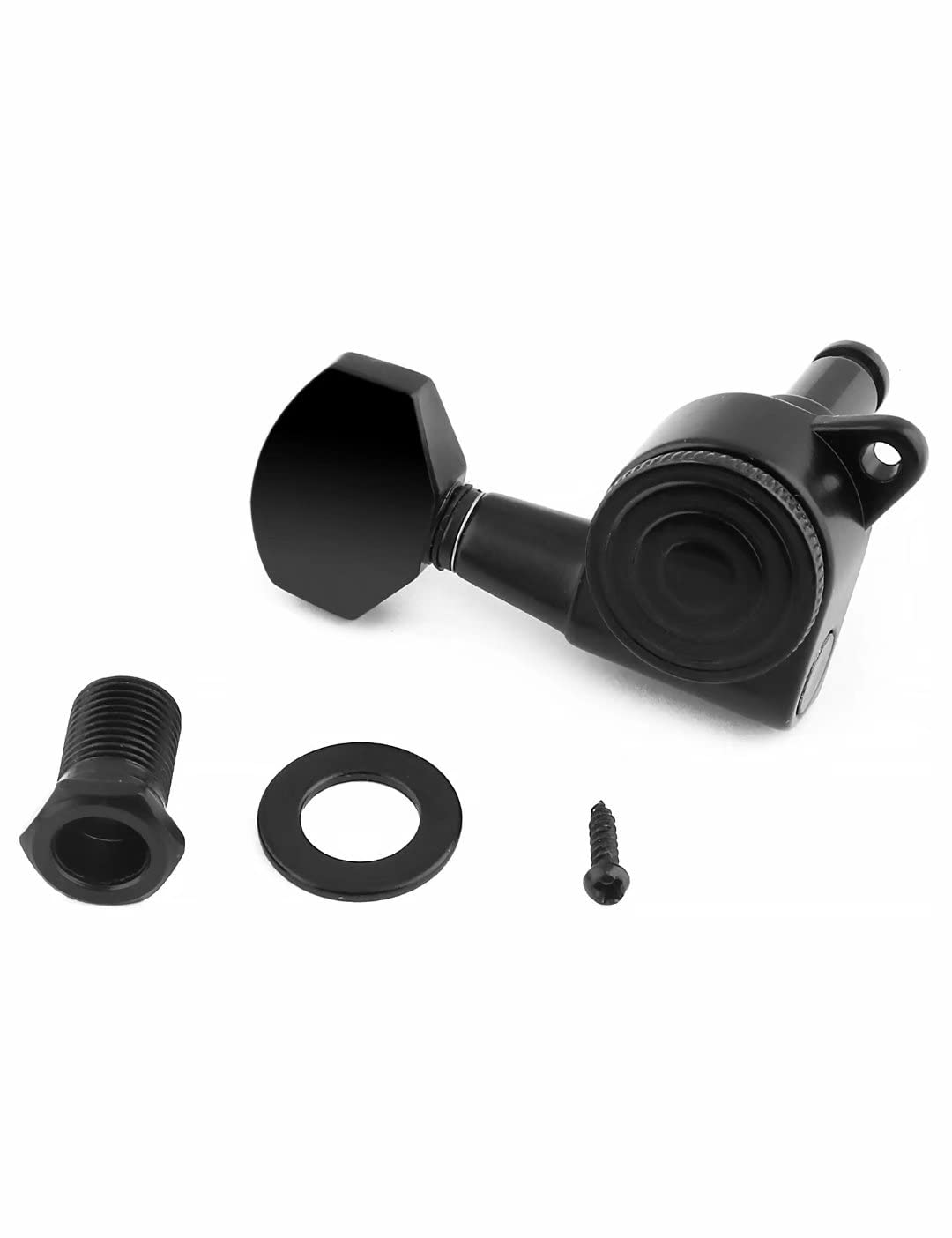 PRODUCT DESCRIPTION These tuners feature a thumbwheel locking function to keep your strings securely in place. This prevents string slippage and also enables you to cut off your excess string. You don't have to wrap the string around the posts several times like you do with an non locking machine tuner. Simply thread the string though the hole in the peg, then twist the thumbwheel to secure it in place. Simple and effective, and speeds up re-stringing. The new sleek design and smooth 1:18 gear ratio give you a great combination of tuning stability, accuracy and good looks. These tuners have a sealed housing & mounting screw hole at 45 degrees. With heavy duty internal gear, sturdy and convenient. The guitar will not off key if you lock the screw post when tune the guitar properly. Easy to install, great replacement for your old or dirty guitar tuning pegs. SPECIFICATION Quality sealed locking guitar tuner set Twist-locking thumbwheel function Material: Zinc alloy Colour: Black Precise 1:18 ratio. Requires 3/8(10mm) peg head holes Location: 6 right For most modern peg head applications 100% brand new, high quality construction PACKAGE INCLUDE 6 x Guitar locking tuners (6 in line for right handed)6 x Ferrule6 x Threaded bushing6 x ScrewIMPORTANY NOTE Kindly check your instrument if this item is suitable for according to the item specifictions before you place the order. Thank you!