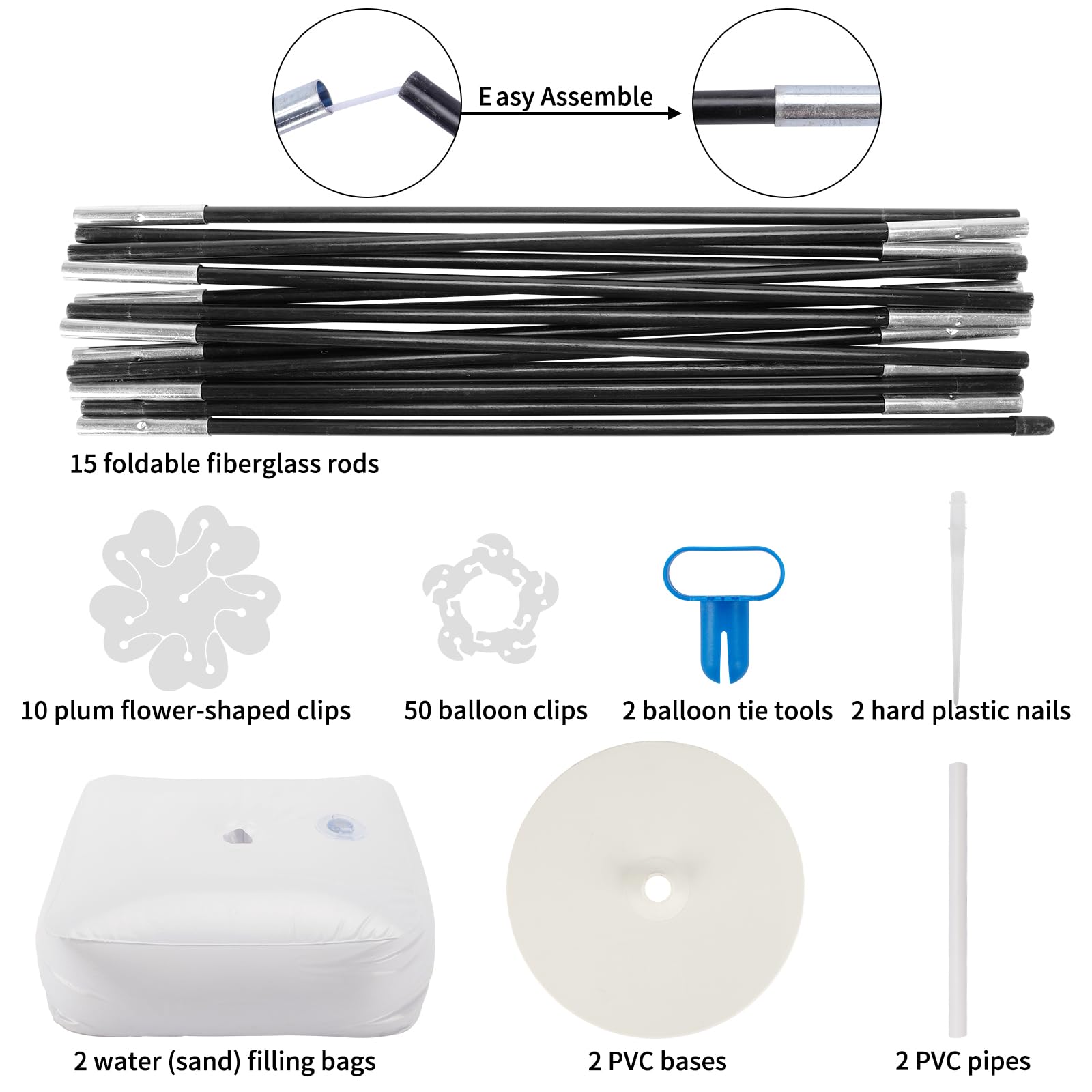 - Complete Package: This balloon arch stand kit includes 15 foldable fiberglass rods, 2 PVC bases, 2 PVC pipes, 2 water (sand) filling bags, 50 balloon clips, 10 plum flower-shaped clips, 2 balloon tie tools, 2 hard plastic nails, 2 rolls of glue, 1 roll of balloon decoration tape, enough to make beautiful balloon arch.