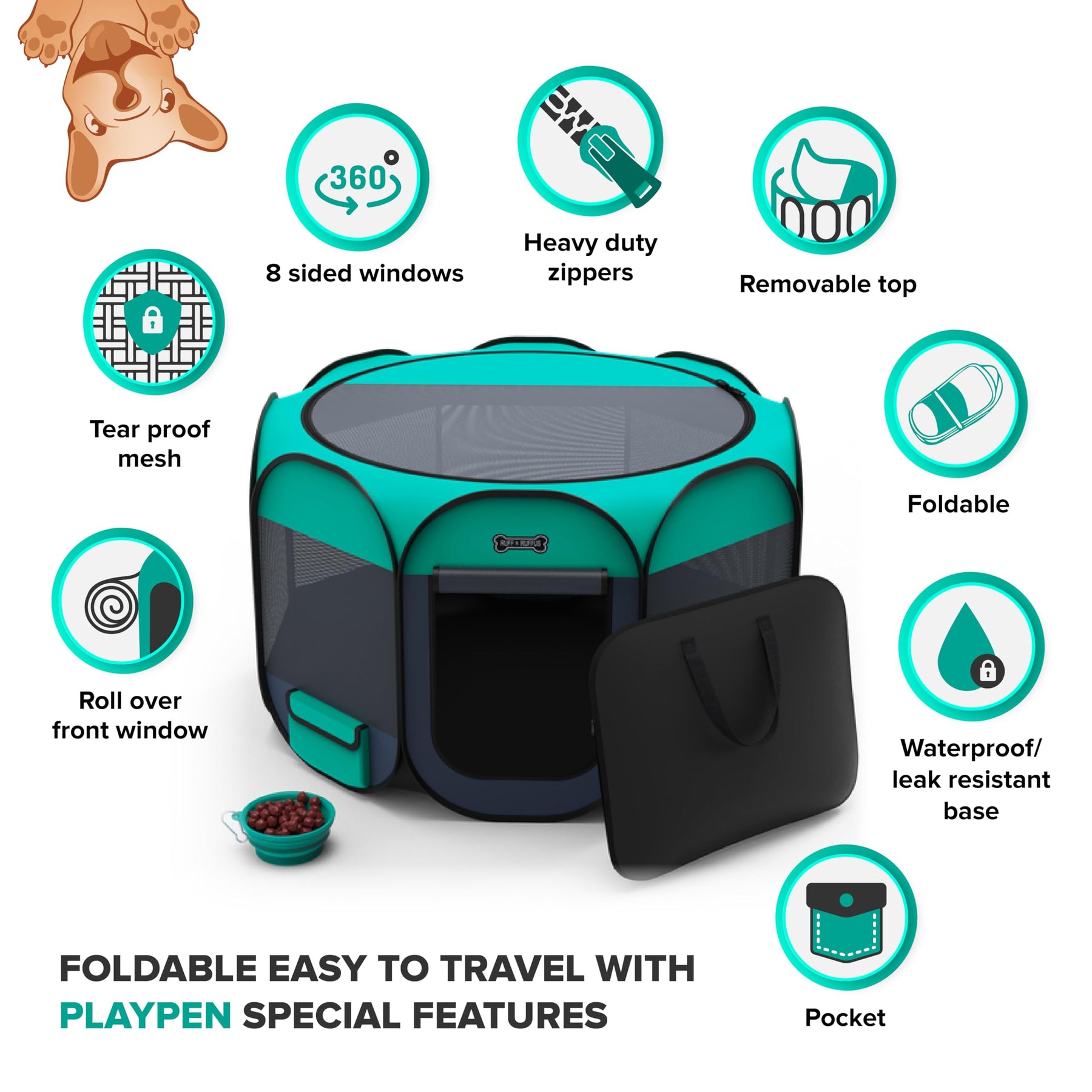 - BONUS INCLUDED! The Portable Pet Play Pen comes along with a convenient carry case and a collapsible 16 oz. food bowl. Ideal for Travel.