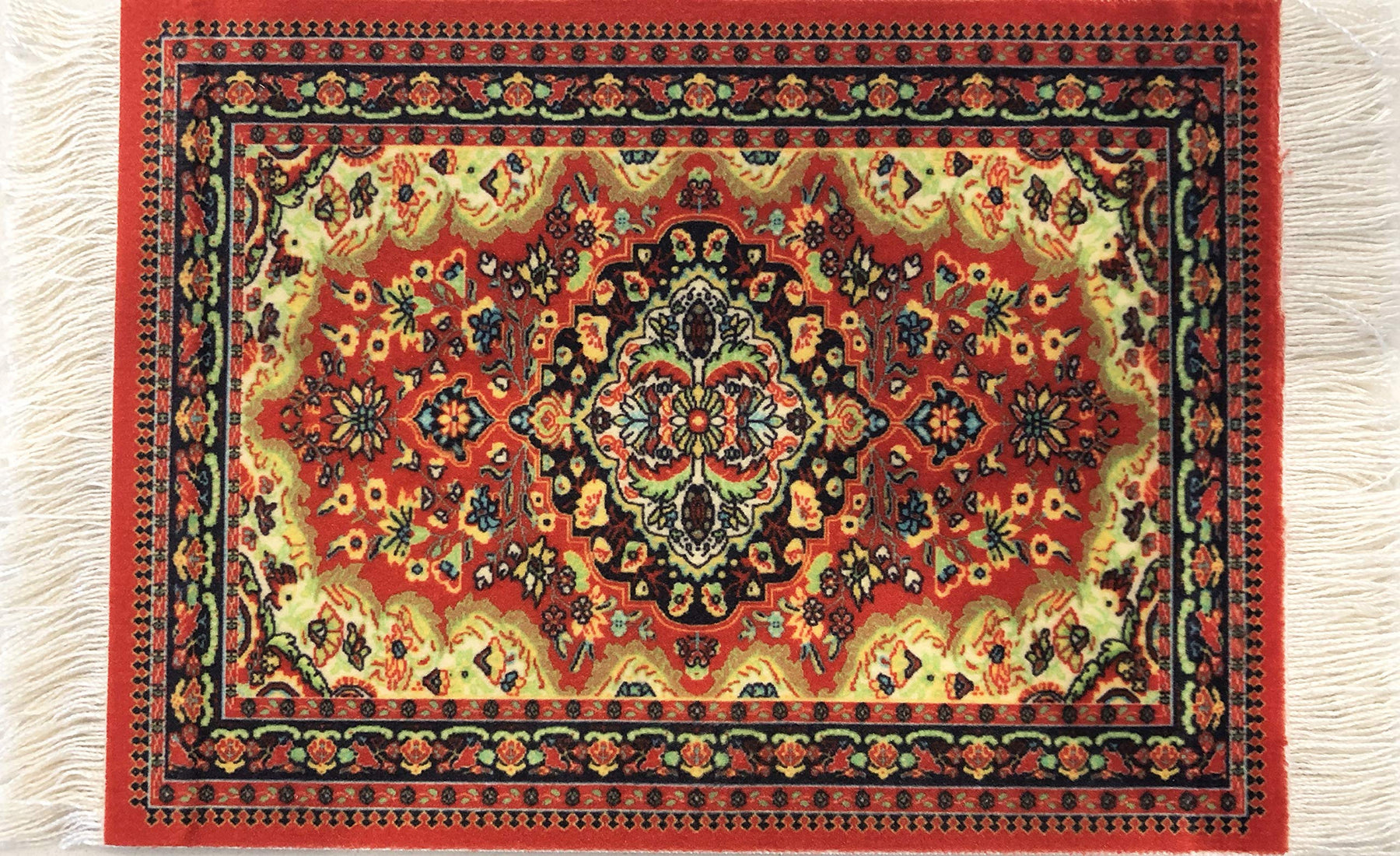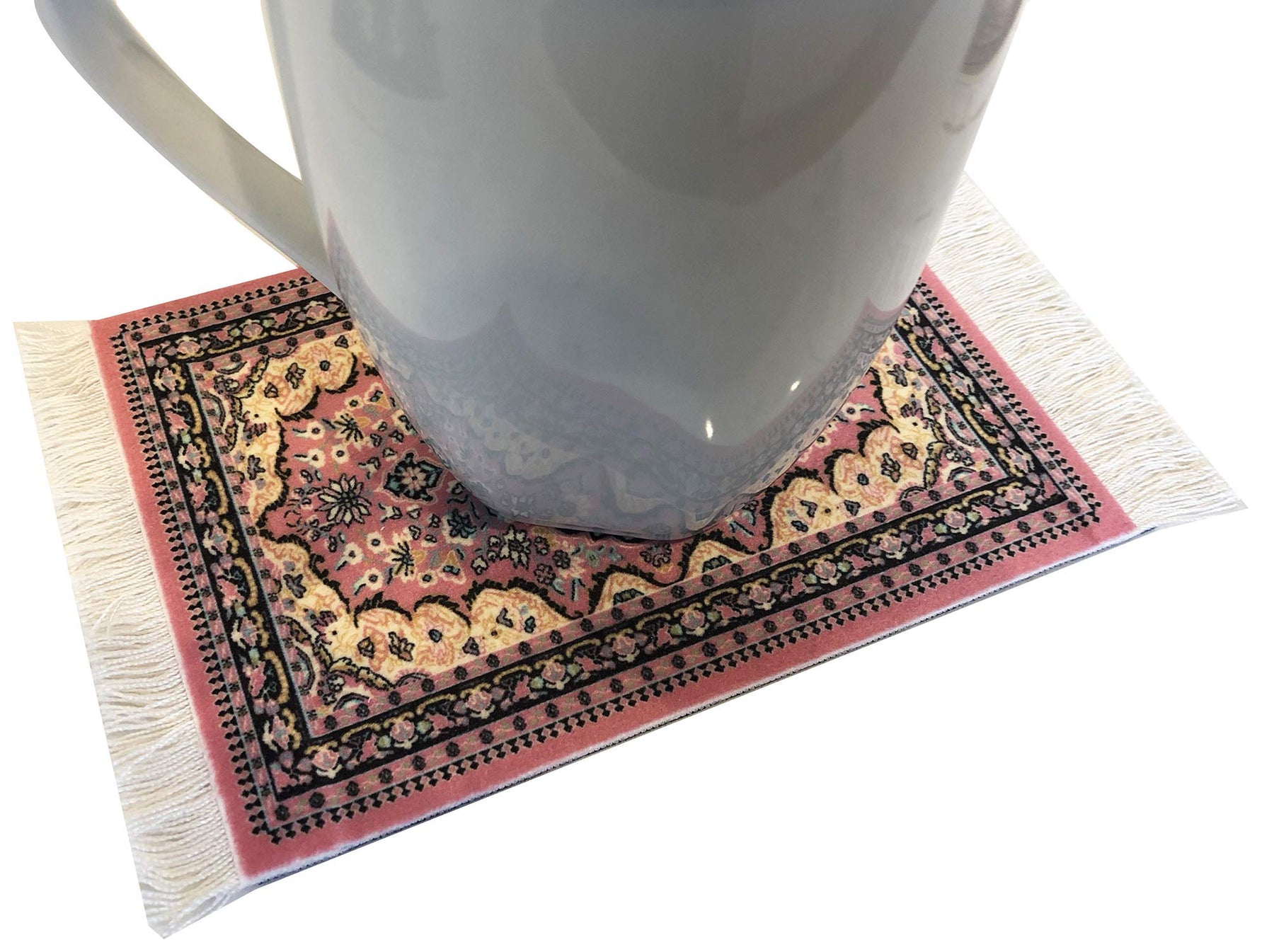 - FUNCTION MEETS STYLE. Take your tabletop decor on a flying magic carpet ride with our SET OF 4 CUP COASTERS! Our carpet coasters are mini versions of authentic Oriental rugs and are completed with real white fringes on the sides to complement your table setting!