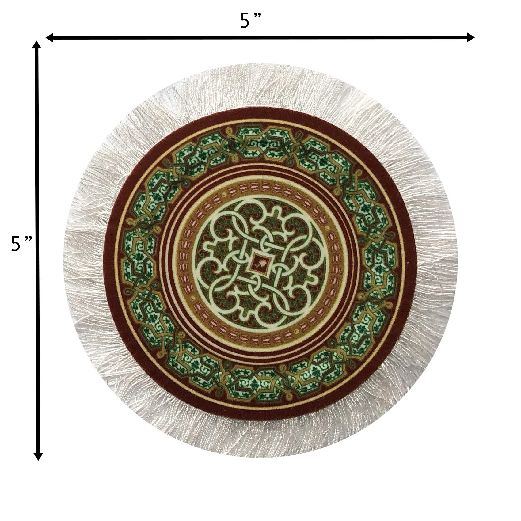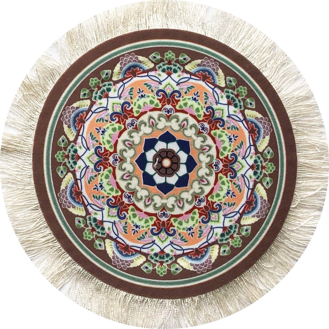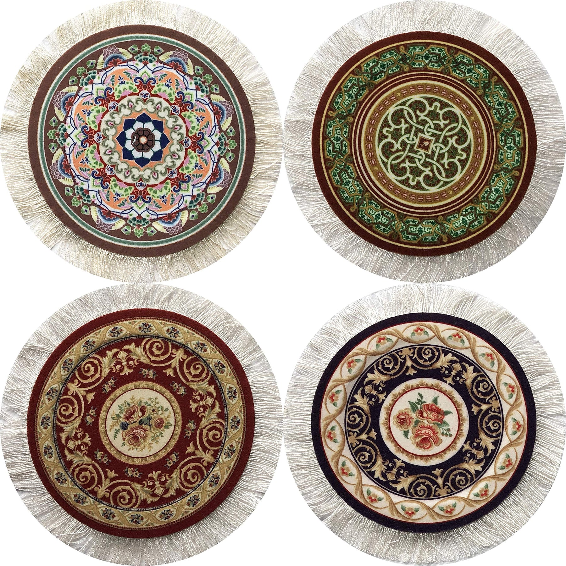- FUNCTION MEETS STYLE. Take your tabletop decor on a flying magic carpet ride with our SET OF 4 ROUND RUG COASTERS! Our carpet coasters are mini versions of authentic Oriental rugs and are completed with real white fringes on the sides to complement your table setting!