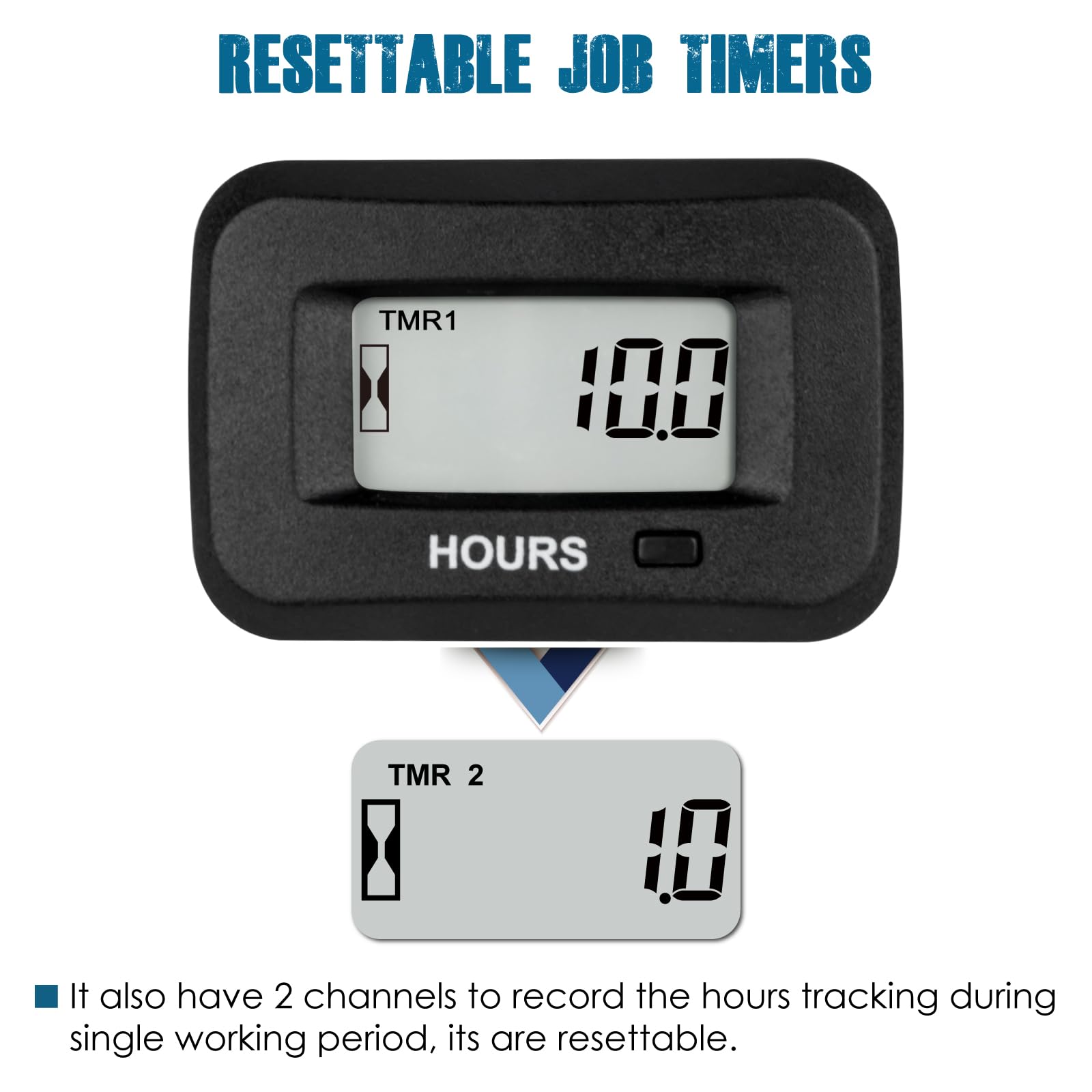 - HOUR METER ---- It record the total working hours when machine is on(For some types of riding lawn mower,sit on the seat to enable the pressure switch on, then the hour meter will begin to record),with ability to set the start hours for hours running; 2 resettable hours running during a single working period.Hours range: 0 to 99,999 hours;