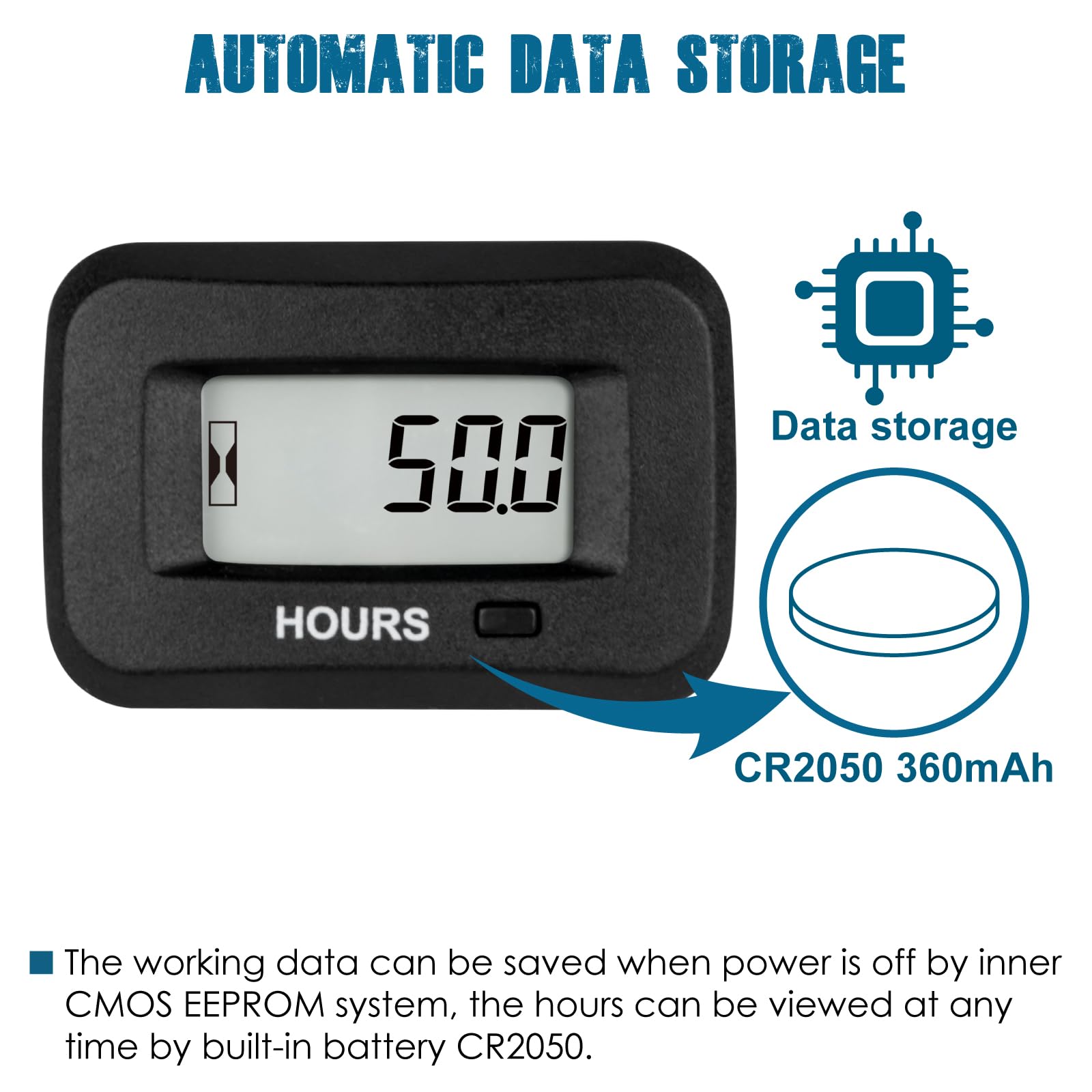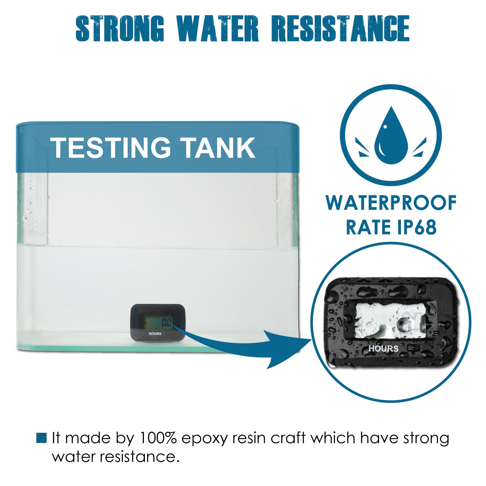 - WATER RESISTANCE ---- This hour meter is made by 100% epoxy resin craft, it have strong water resistance and run normally into 10 meters underwater up to standards IP68.