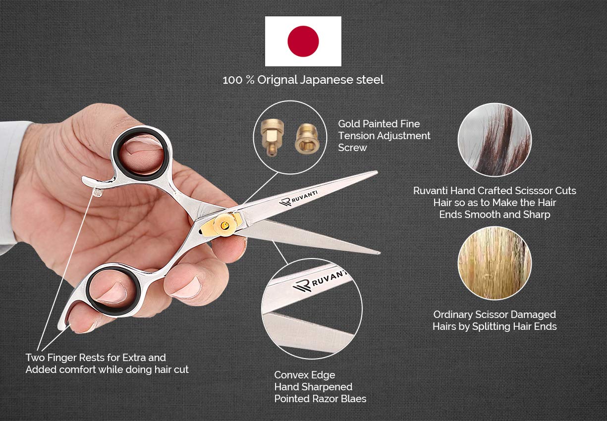 - Ergonomic Shape: Ruvanti's Professional Razor Edge Left Hand Hair Cutting Scissor is hand crafted with Convex edge and hollow-ground concave blades. This excellent quality scissor is prepared with a unique anti skidding design and its special convex blades are sharp and completely safe to use on men, women, the elderly, children, and babies.