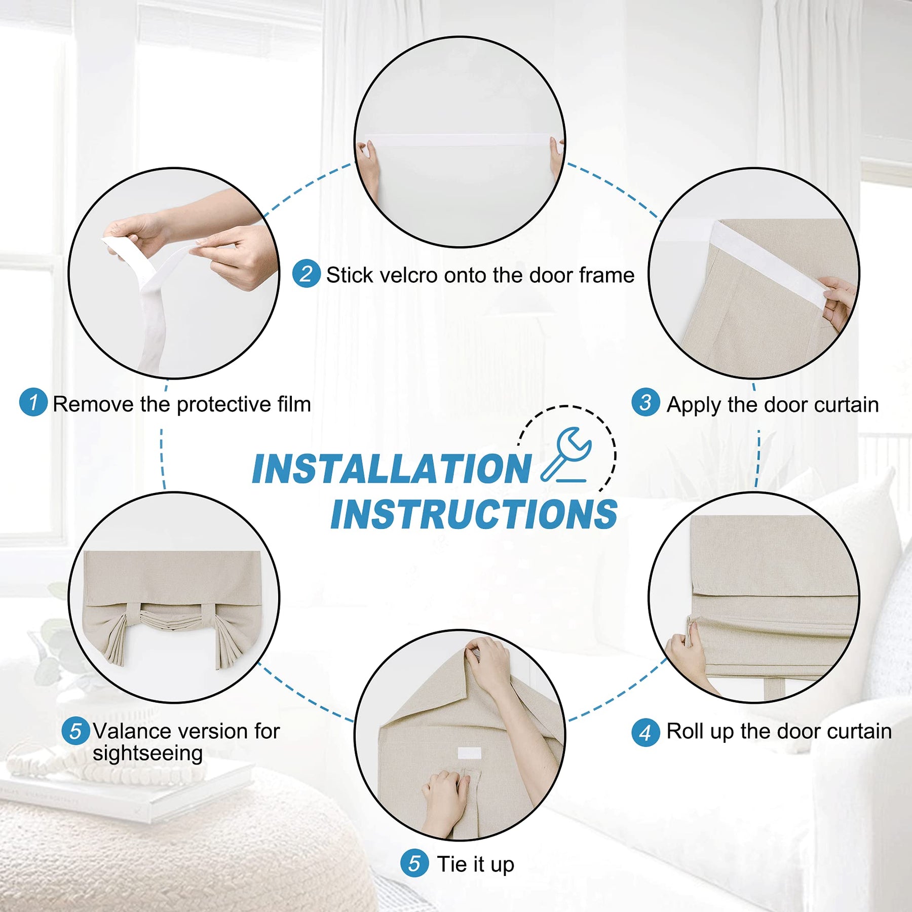 - EASY INSTALLATION: No tools or curtain rods are required. Enhanced strong adhesive strips ensure that you can hang the door curtains easily anywhere. Also, tie up the curtain with straps attached for sightseeing or the drapes down for full privacy.