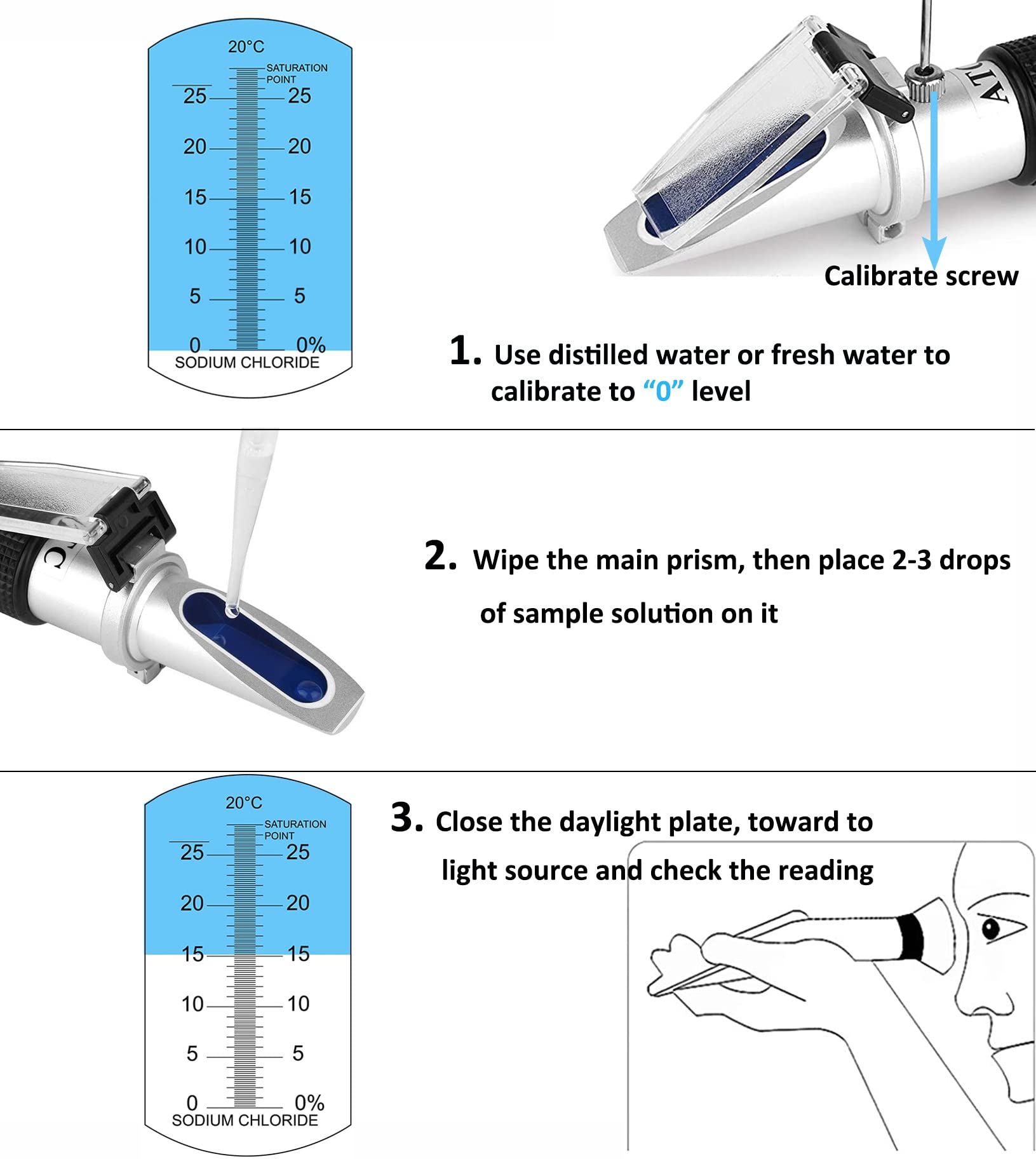 Easy to USE: sodium chloride refractometer calibrated at factory, just put 2-3 drops of sample solution on the prism, towards light and wait for seconds, then you can get the accurate readings.