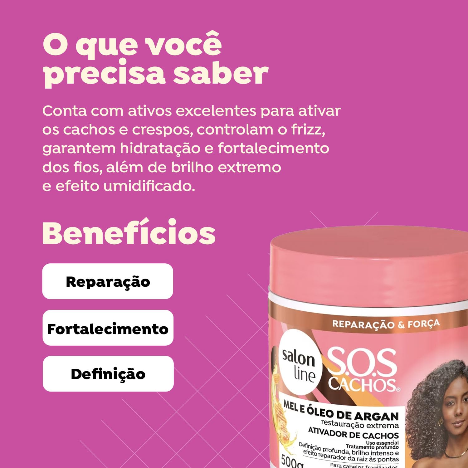 O Ativador de Cachos Mel Cachos Intensos S.O.S Cachos conta com ativos que ativam e definem os cabelos cacheados e cabelos crespos, controlam o frizz, garantem hidratacao e fortalecimento dos fios, alem de brilho extremo e efeito umidificado. Condicionador sem enxague. Tem Acao condicionante.