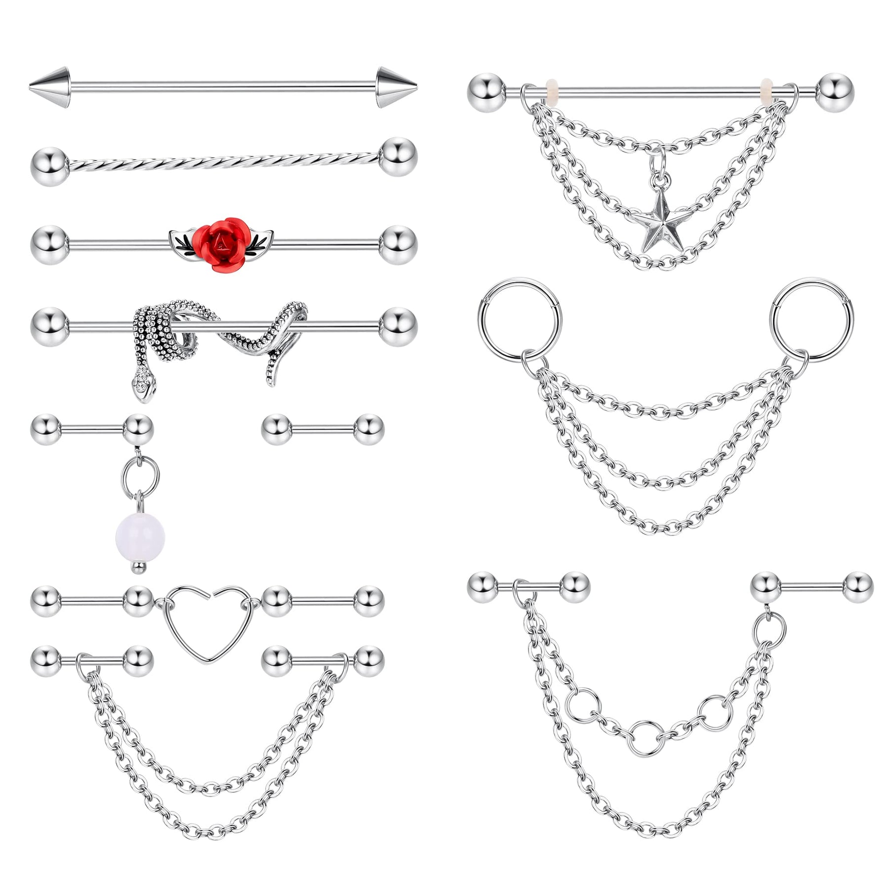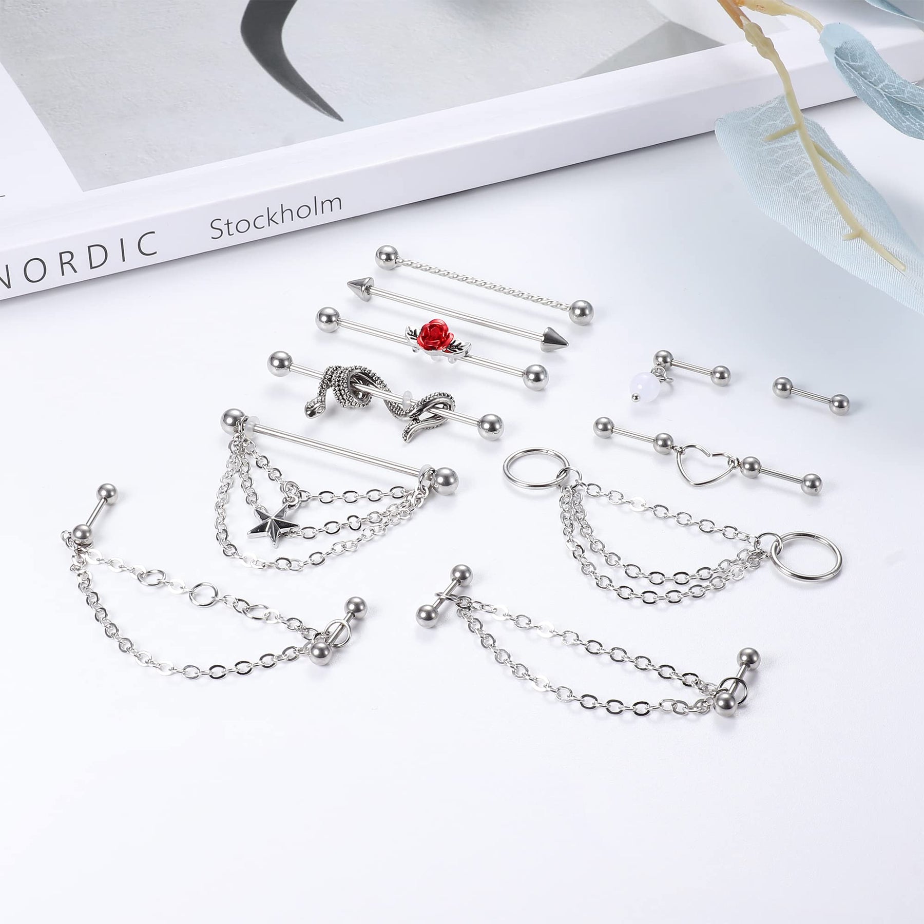 - Industrial Piercing Jewelry Set: One order includes 11 pieces of industrial earrings: snake industrial earring, red rose industrial earring, chain industrial piercing jewelry, short industrial earrings and so on, mix styles give you changeful outfit. Come with one free velvet pouch.