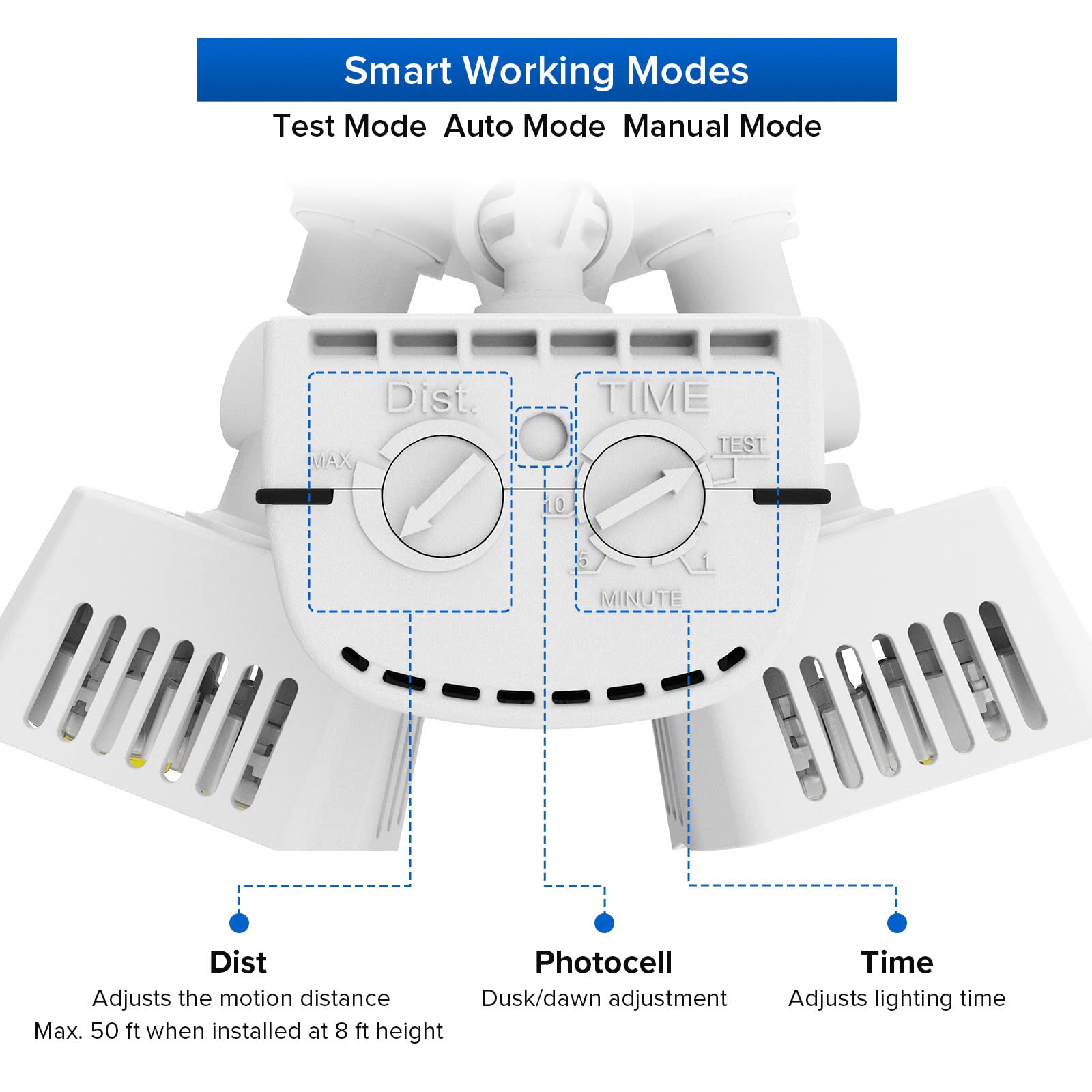 - AUTO ON AND OFF: Dusk-to-dawn photocell activates at nightfall and powers off in the daylight. Auto-on when motion is detected in the night, auto-off after pre-determined time when no further motion is detected. There will be NO false detection with this light. Sensing light levels and motion are with a range of 180 degrees and out to 50 feet when being wall mounted 8 feet high.
