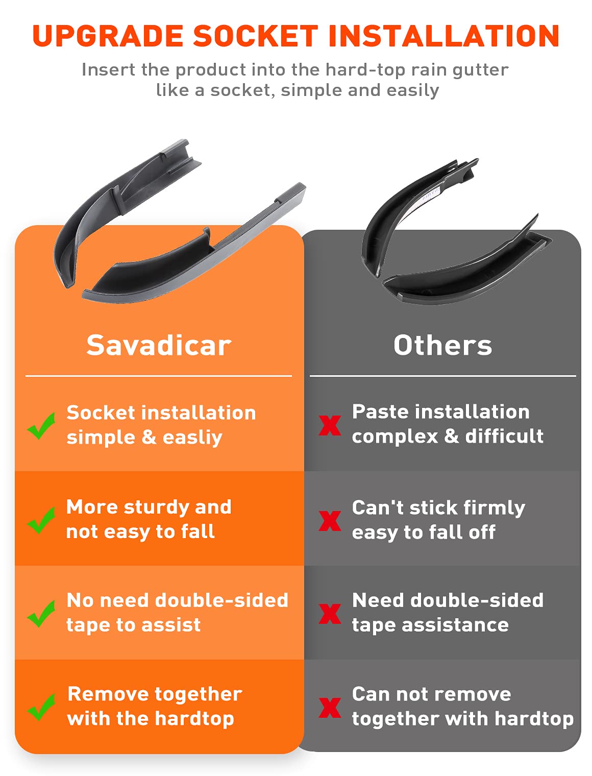 - UPGRADED VERSION -- Savadicar Rain Gutter Extensions is a brand new upgrade based on the first generation Wrangler JK Rain Gutter Extender, change the paste installation method to the socket installation method, use the structural bite force and friction force to fix the product, so that the product installation can be more firmer.