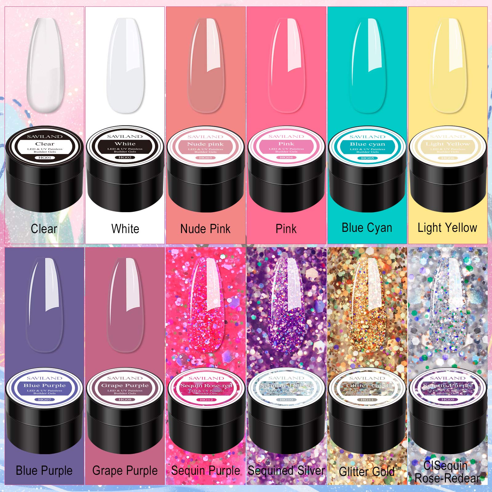 - 12 COLORS BUILDER NAIL GEL NAIL KITSaviland gel extension nail kit comes with 12 selected nail extension gels (8pcs solid color and 4pcs sequins), 3pcs nail brushes and 10pcs nail forms. This nail extension gel set is very friendly for nail technicians, nail lovers and nail beginners, and can create beautiful nail art at home anytime.