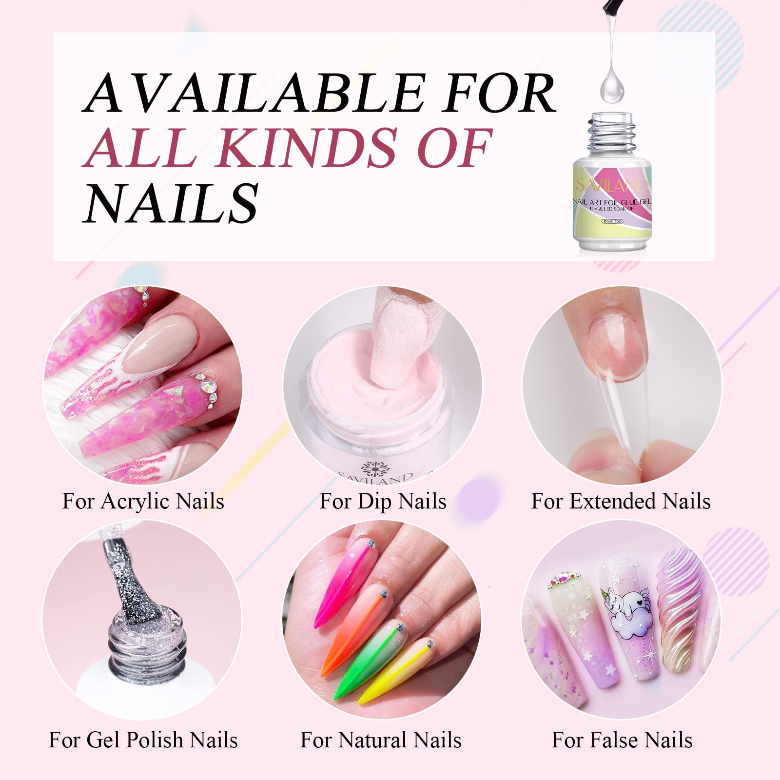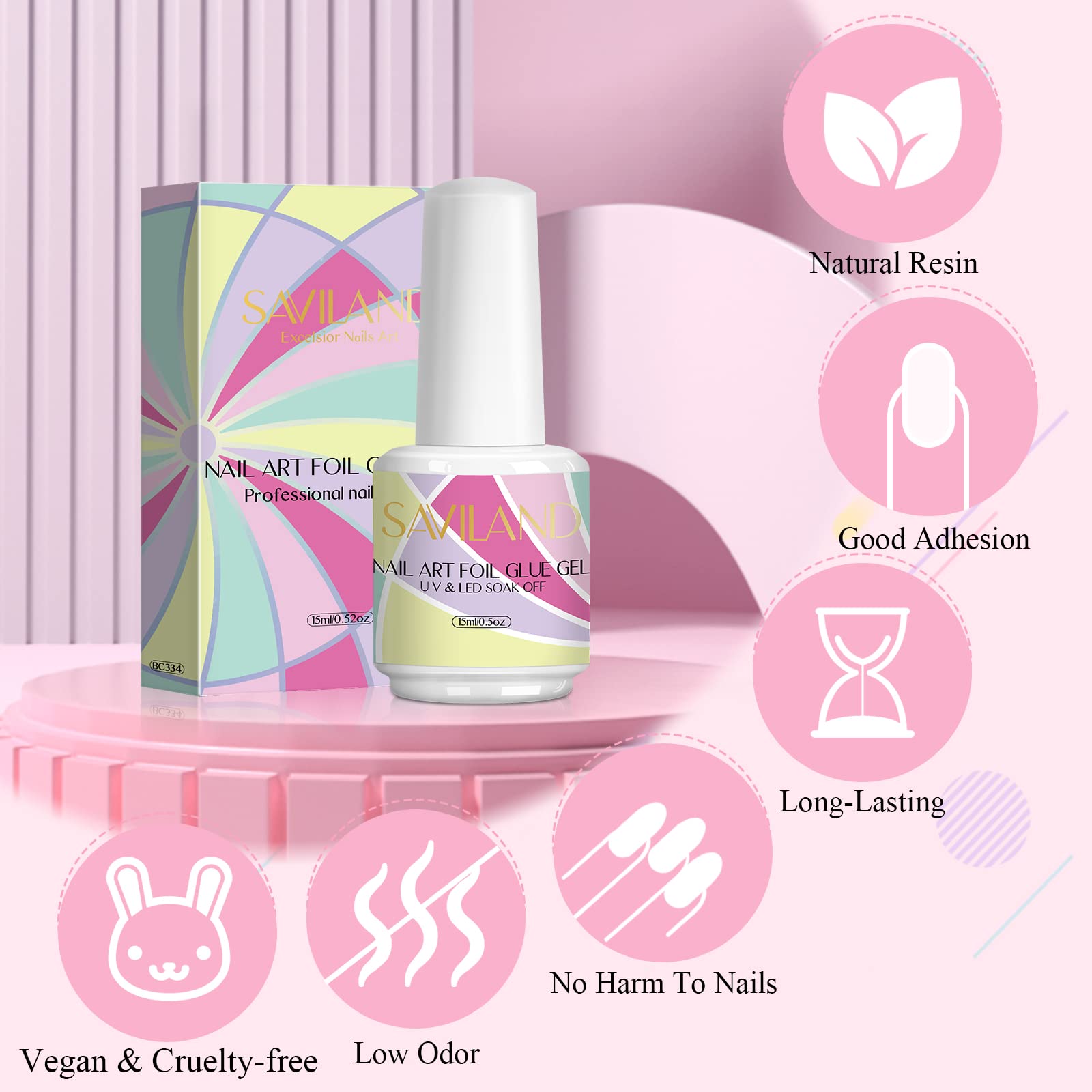 - UPGRADED & HIGH-QUALITY - Saviland nail foil glue is made from natural resin and health ingredients, vegan & cruelty-free, low odor and no harm to nails. Has better stickiness and smoother than any other nail foil glue. Can be used on acrylic false nails, builder extension nails, artificial nails, U V gel nails, etc.