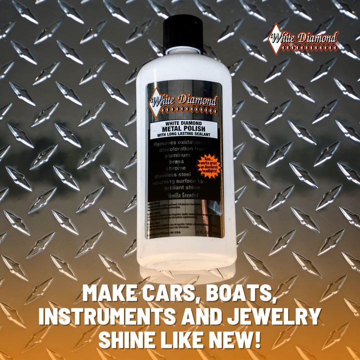 - MULTI-PURPOSE: White Diamond Metal Polish cleans, polishes, and seals a huge variety of surfaces. It's perfect for stainless steel, aluminum, silver, gold, chrome, brass, copper, pewter, and even glass, fiberglass, and headlights.