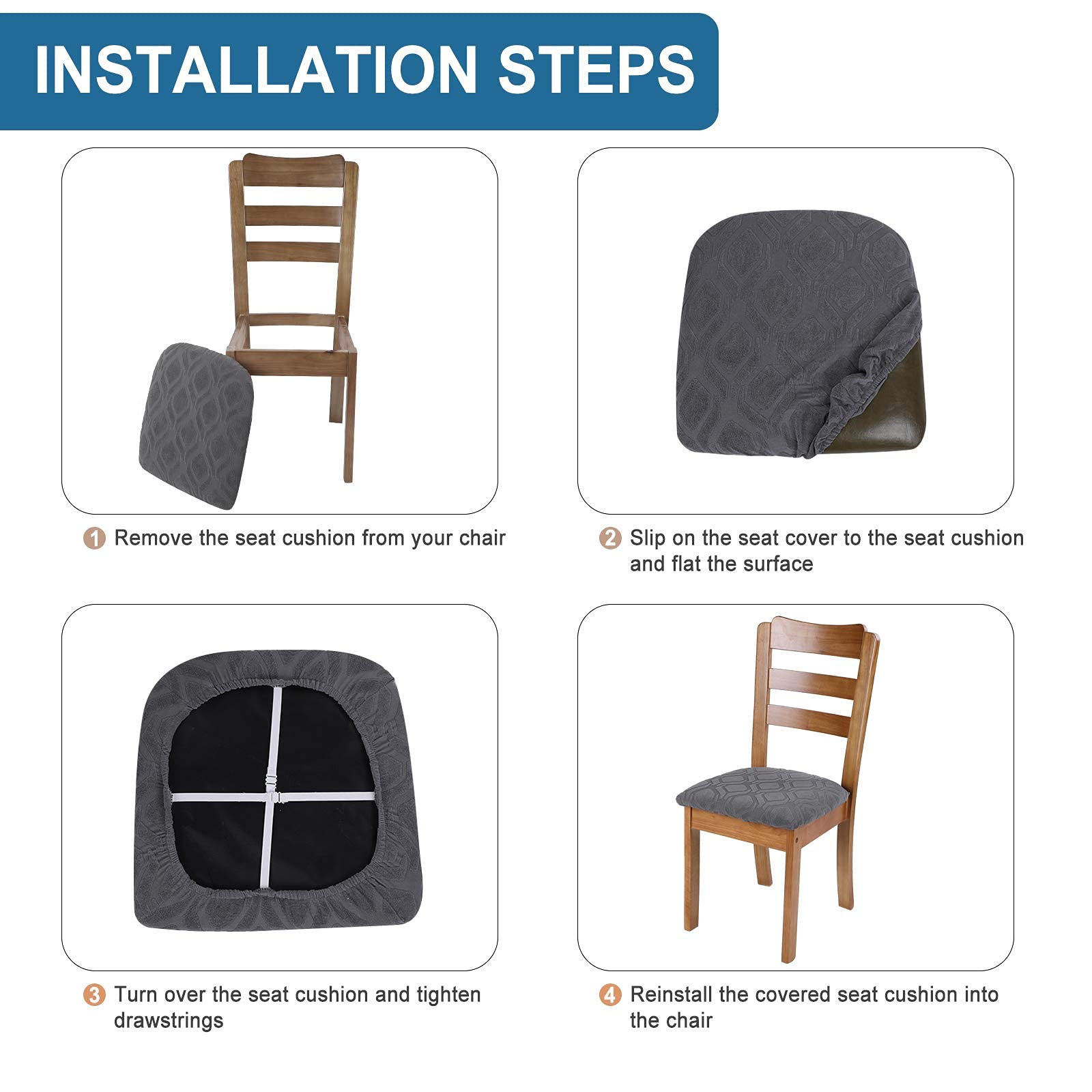 - Premium Chair Seat CoversMade of high quality polyester and spandex featuring two-way stretchy to fit most of dining chairs snugly, kitchen seat covers with unique jacquard fabric design, anti-pilling, wrinkle resistant and durable, soft and thick to better prevent stains from penetrating quickly; secure the cover firmly in place with the sewn-in elastic band and 4 straps to avoid slipping, practical for your home decor.