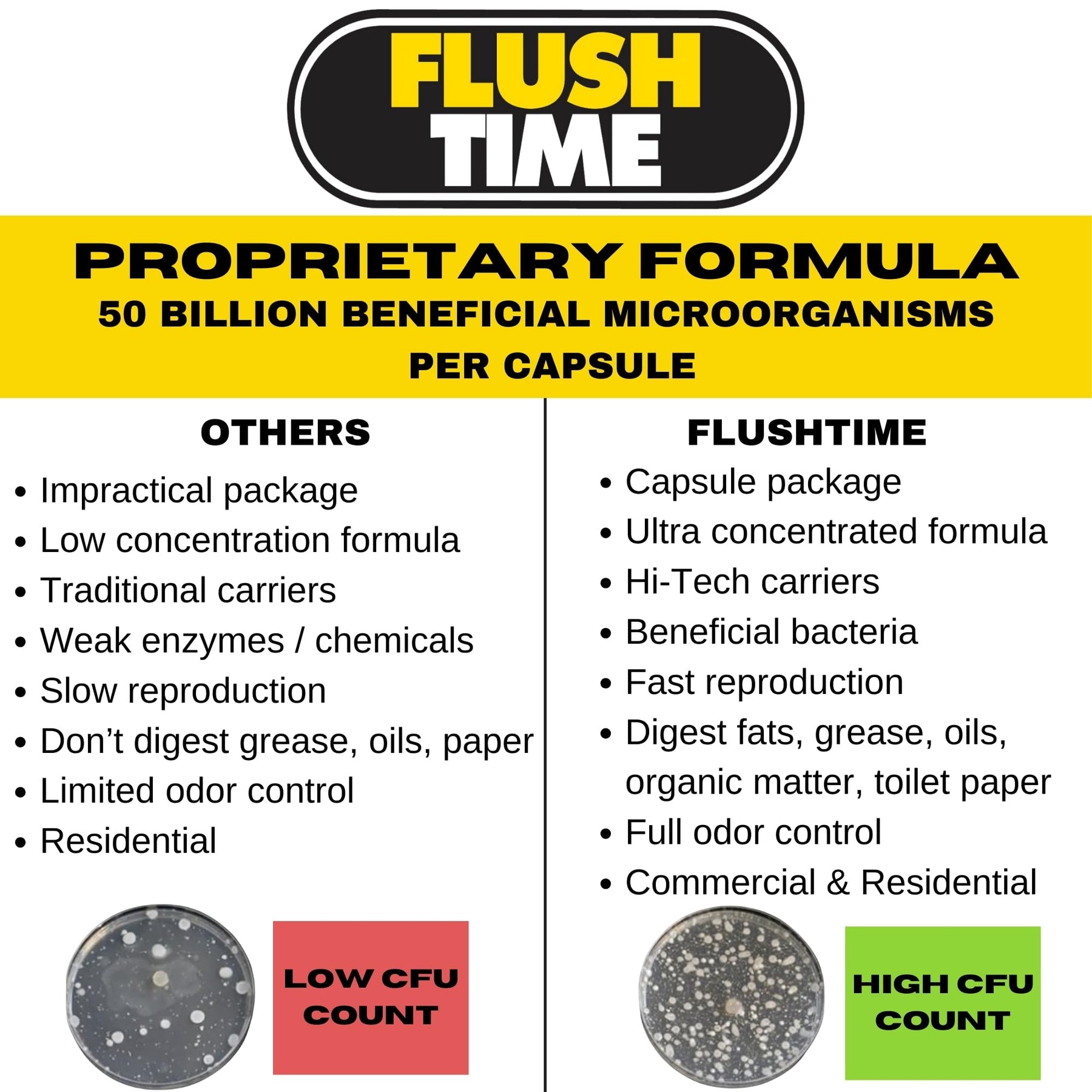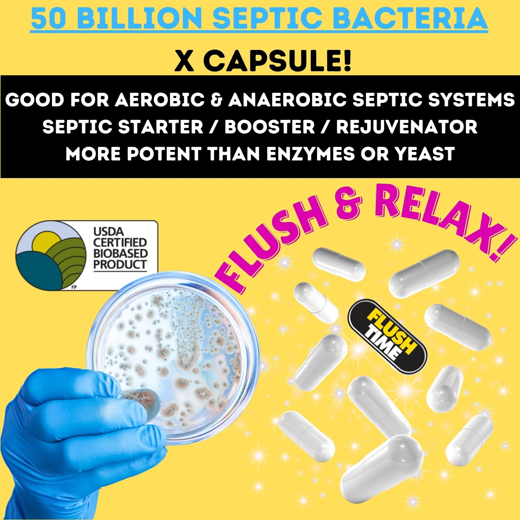 - FLUSHTIME capsules contain billions of carefully selected beneficial bacteria cultures, scientifically chosen to activate enzymes that reduce solids and decompose various types of waste in your septic tank and leach field. Our capsules dissolve in the septic tank rather than in the toilet or pipes; this makes it a better alternative to septic tank treatment pods, packets, tablets, liquids or gels.