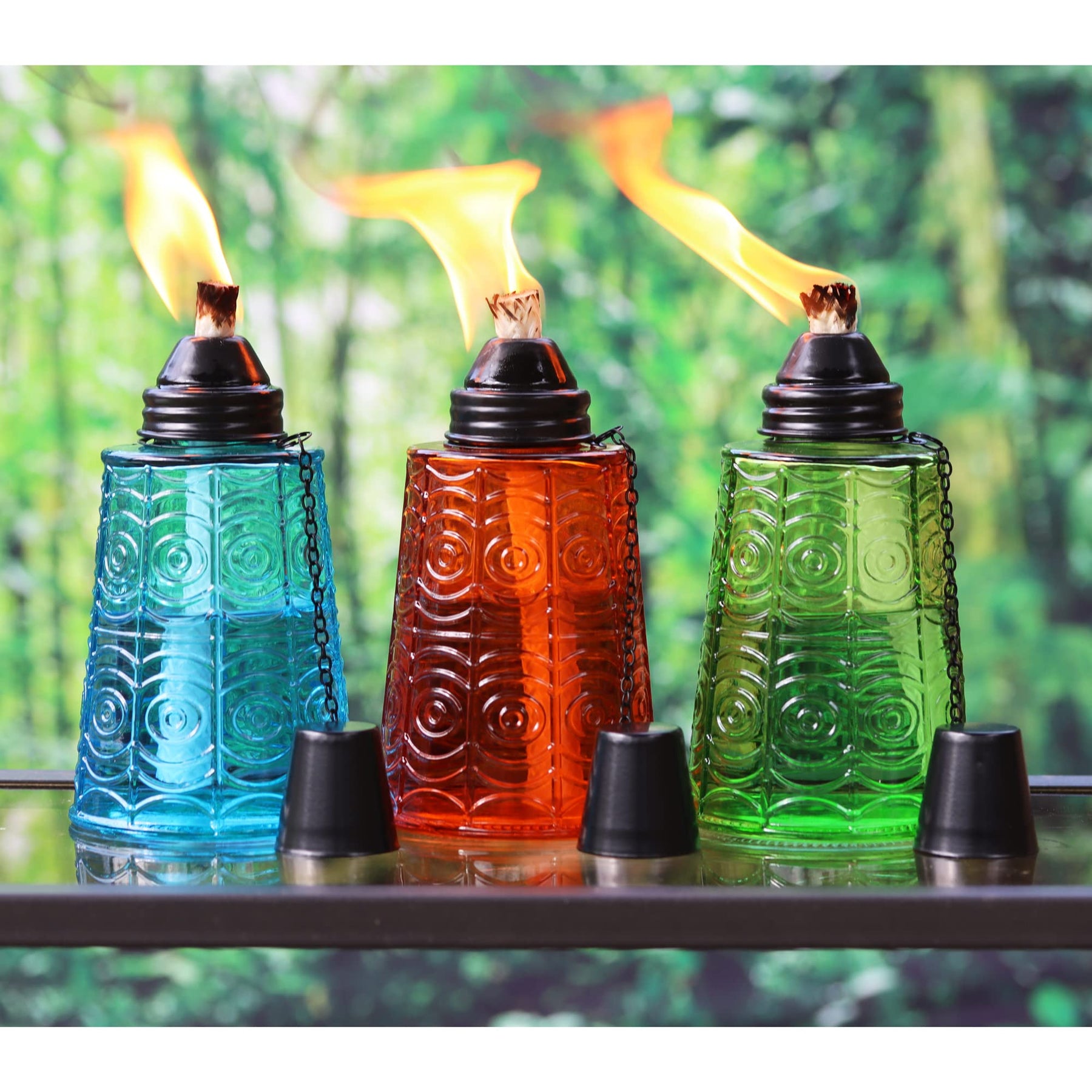 - Original Torches – Citronella Table Top Torches for Outdoor Patio, 16oz Decorative Glass Torch Citronella Oil Candles for Outside Deck, Garden, Parties, Set of 3, Blue/Amber/Green by Seraphic