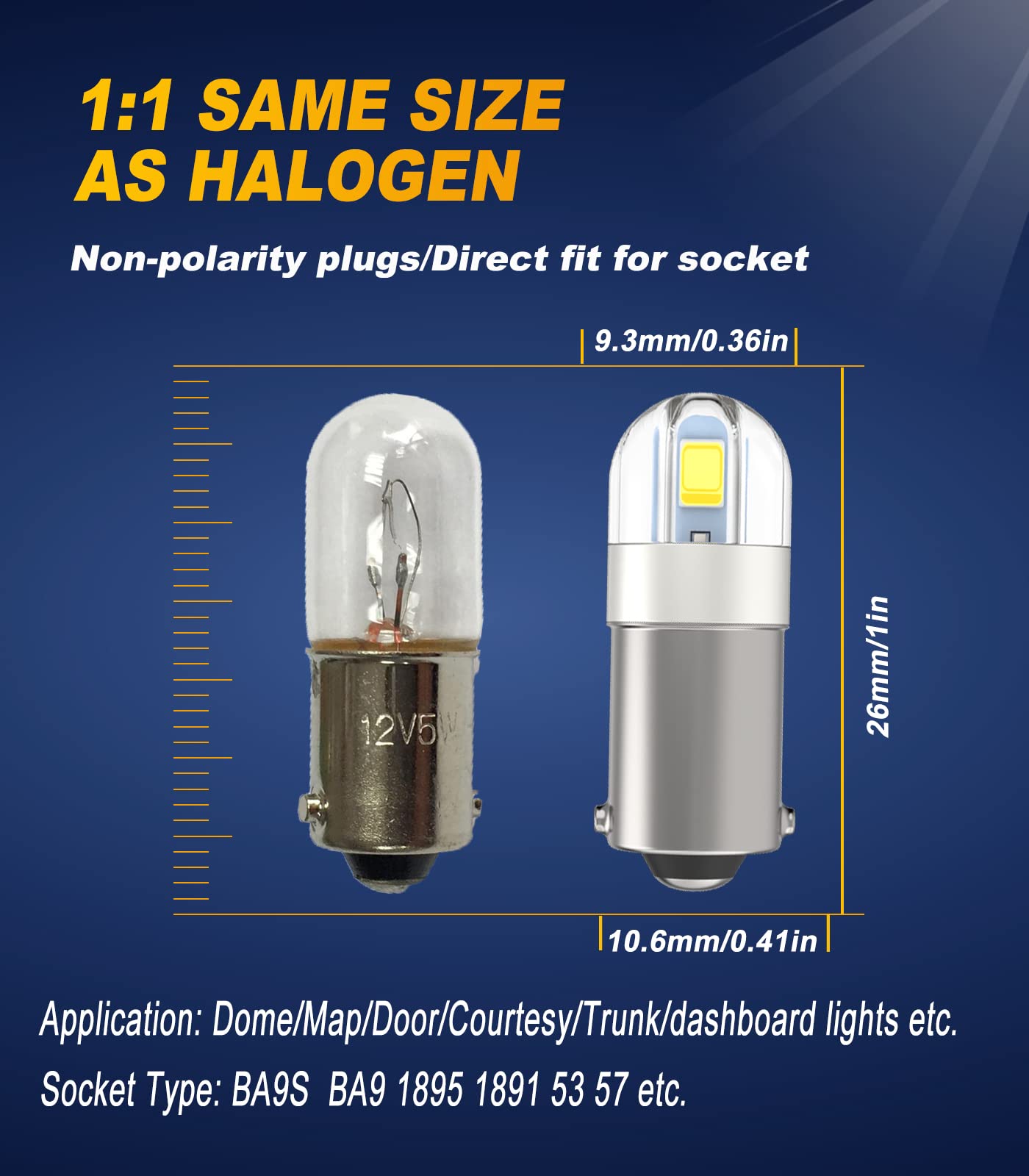 - Original License Plate Lights – BA9S Led Car Bulb BA9 1895 1891 53 57 Led, 2SMD 3030Chips 6000K White 47830 64111 3893 LED Car Bulb for Car Interior Dome Map License Plate Glove Box Light etc, Pack of 6pcs by Serundo Auto