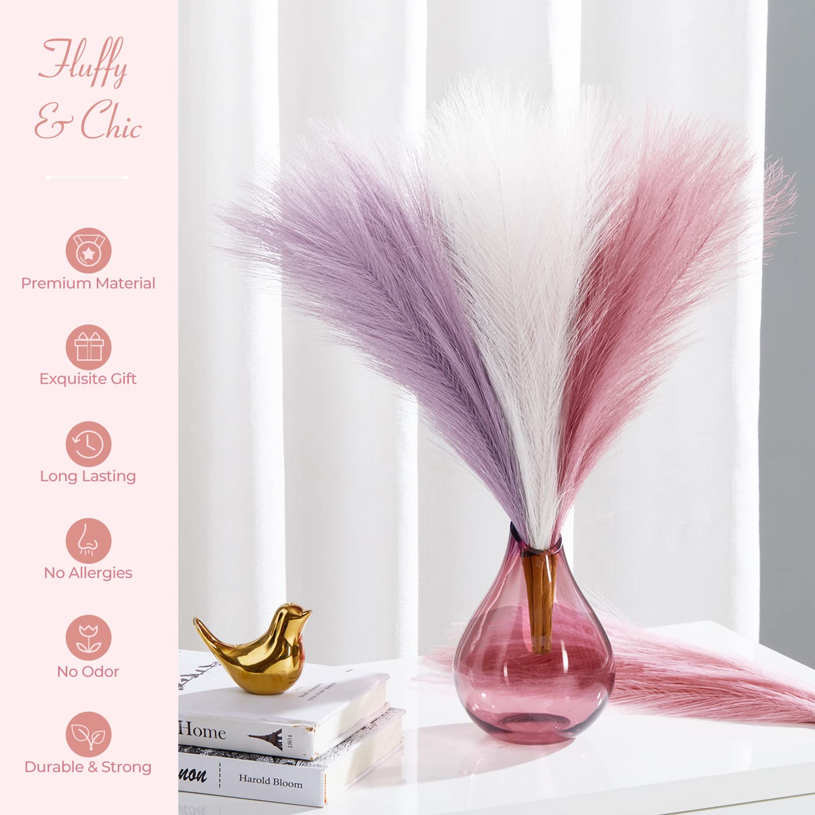 - No Maintenance Pampas Floral- Compared with real dried pampas grass, the faux pampas grass doesn’t shed, which means there’s no need to waste your time on clean the mess it drops. The silk pampas grass won’t cause any allergy. Very safe for children and pets.