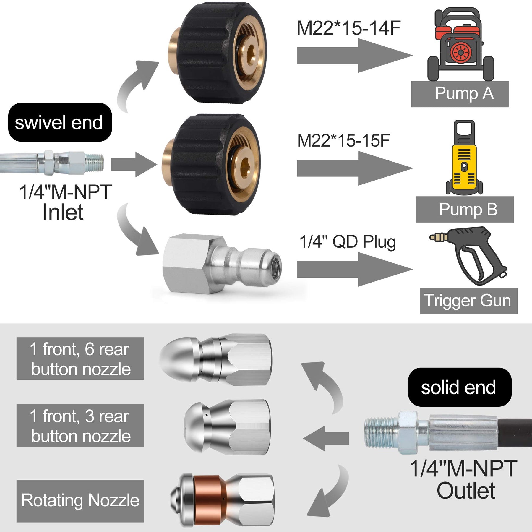 - Kit includes 1 Adapter M22*1.5-14, 1 Adapter M22*1.5-15, 1 Quick connect plug all 1/4'' NPT to match all pressure washers