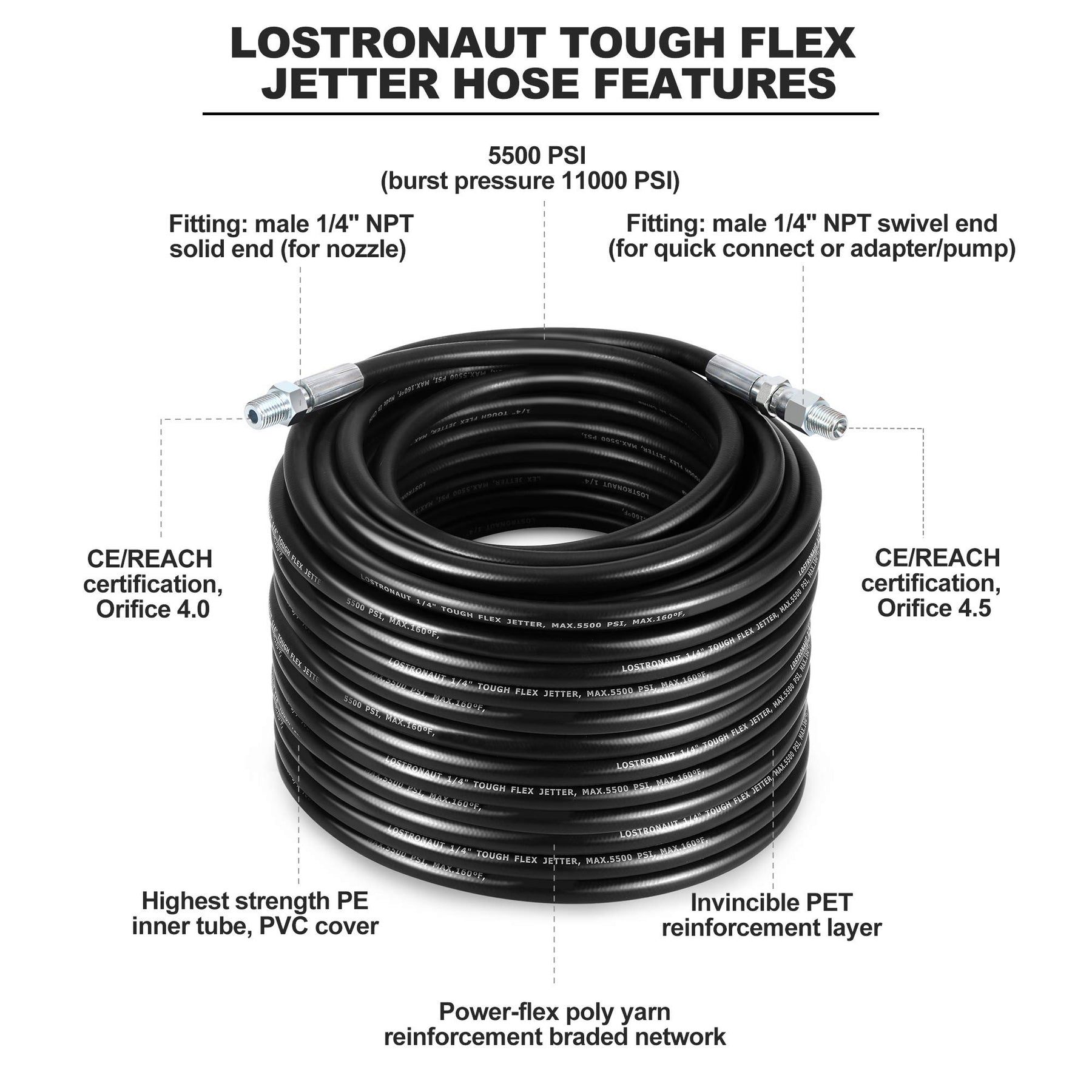- Jet cleaner high pressure kit includes 50 ft pressure washer hose 1/4'' NPT 5500 PSI up to 160F