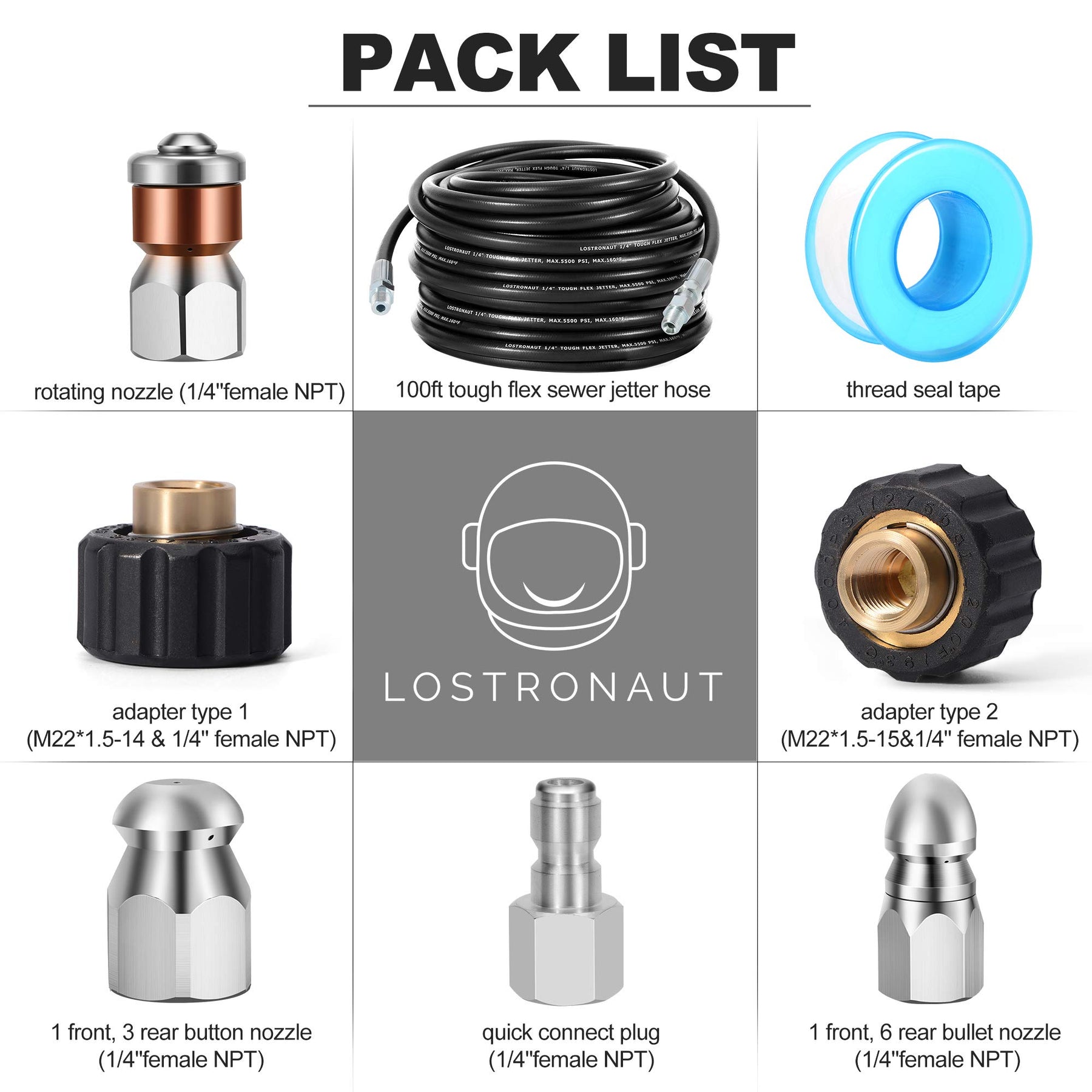 ALL LOSTRONAUT SEWER JETTER KITS INCLUDE: