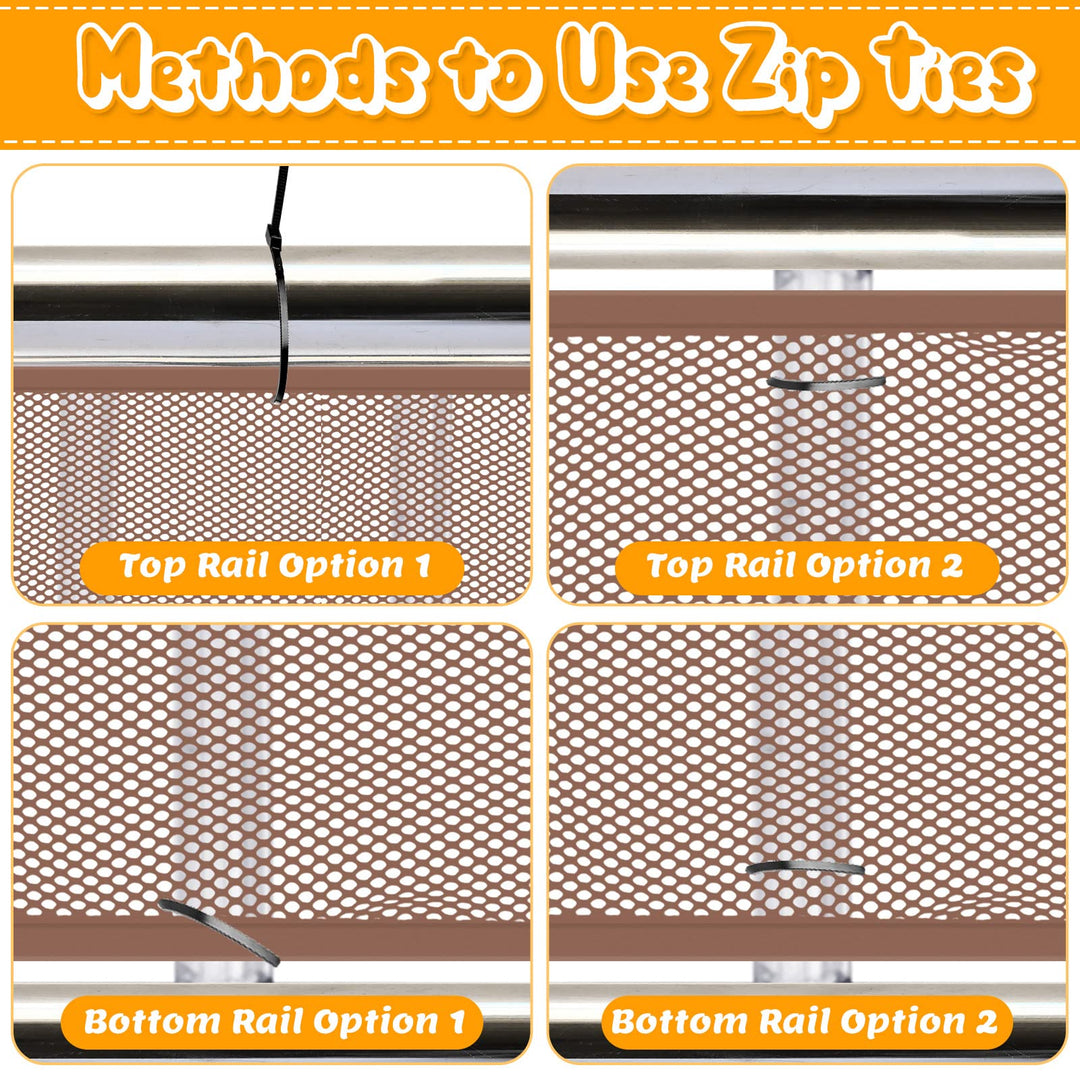 - Comprehensive Package: 2 set of coffee rail balcony banister nets, per set come with 45 pieces of zip ties, enough quantity for installation, and the length of zip ties is 12 inch fits most of banisters and handrail; If you have an oversized railing, you can connect 2 zip ties to extend the net length; Pay attention to first use the zip tie to pass through the mesh net, and then connect the cable tie to extend, because the connector is larger than the mesh hole and cannot be passed through