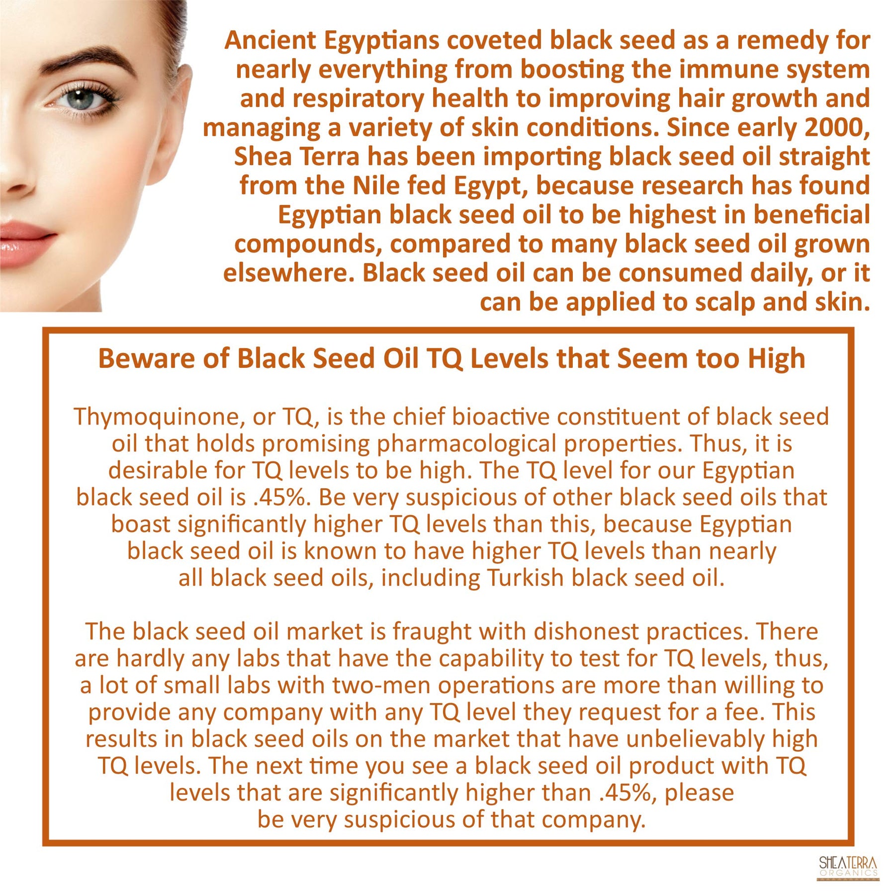 - High Thymoquinone (TQ) Levels: Black seed oil from Egypt is known to have higher TQ levels than many black seed oils, including Turkish oil. Our Egyptian Black Seed Oil has a .45% TQ vs. .4% TQ for Turkish black seed oils.