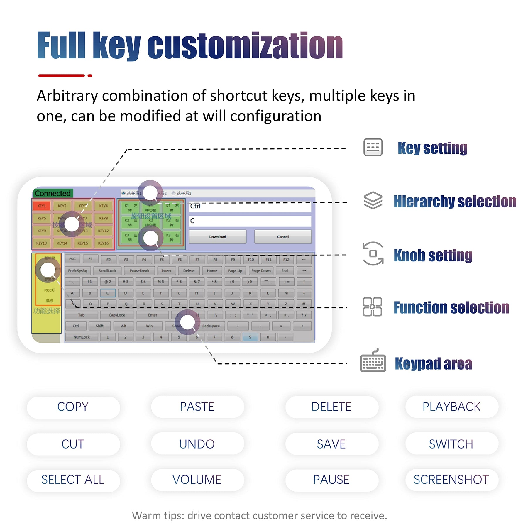 - MULTIFUNCTIONAL MECHANICAL KEYBOARD: The product comes with a manual, you need to our customer service after purchase to get the programming software. 12-key programmable keyboard with adjustment knobs. You can set all key combinations on Windows keyboard, including key mapping, multimedia, shortcut, text string, one key start, mouse, system, macro (support multiple macros), allowing you to implement complex shortcuts with one click to reduce tedious operations.