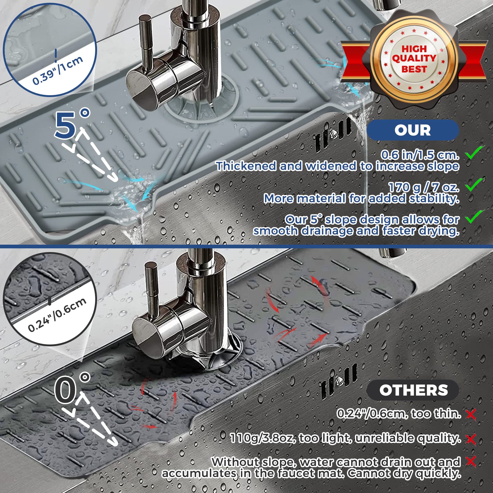 - ???KEEP YOUR COUNTERTOP DRY? Silicone faucets pad new designed for faucet splash with the draining, upgrading your kitchen sink & bathroom countertop in an effort-saving way! This means never gets soggy, or any water spots by the faucet and sink. You don't need to worry about the water staying on the mat or counter.