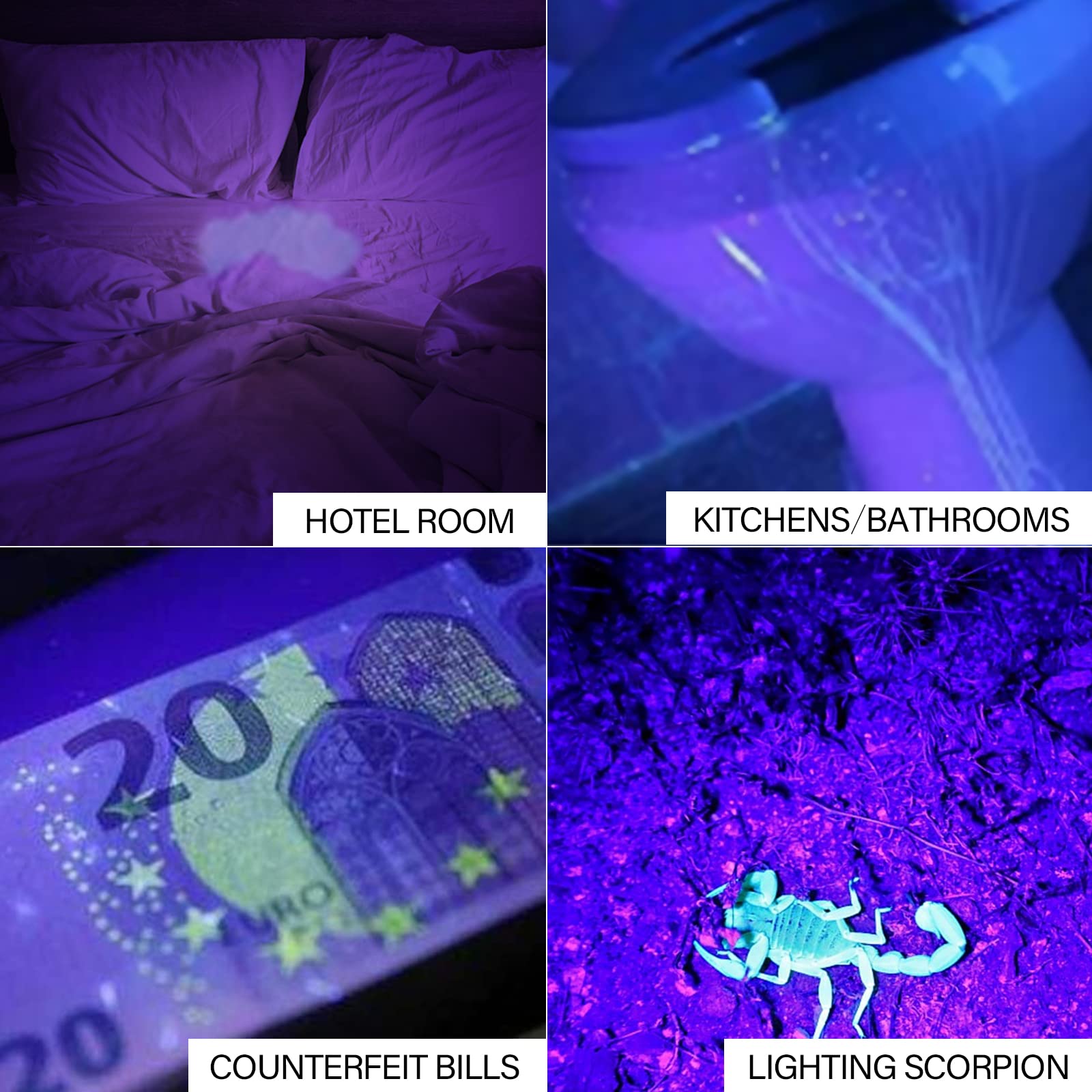 - Black light flashlight and UV protective glasses can be used for Leaking detection, identify items, lighting etc
