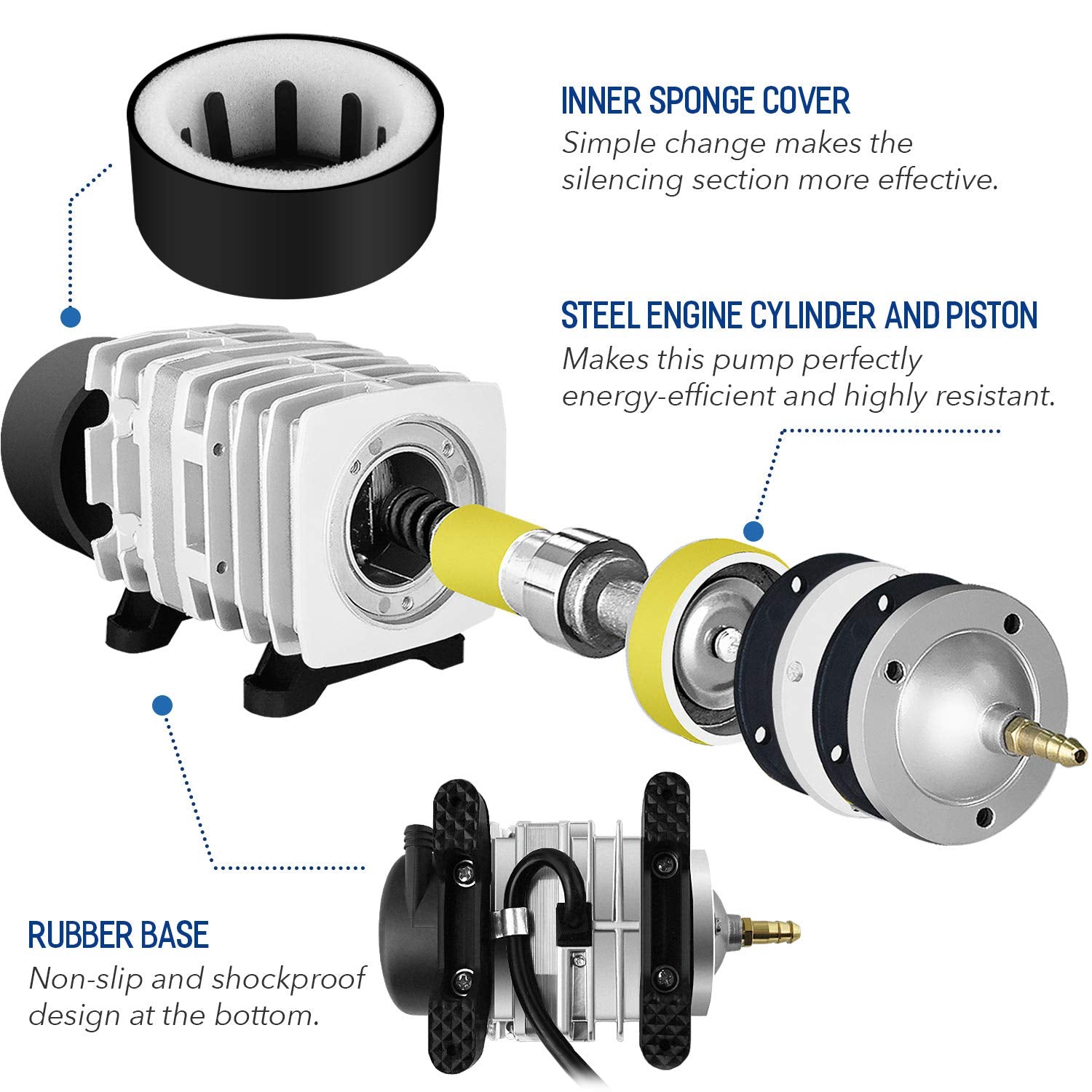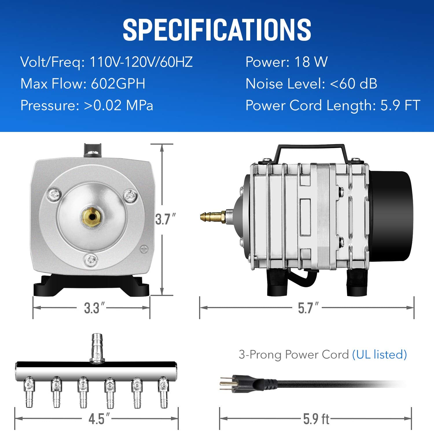 - Best applications: pumping 38 liters of air per minute (10 gallons per minute), low noise (less than 60 decibels) and a 1.8m power cord make it an oxygenated aquarium or pond or plant root in a hydroponic system ideal air pump.