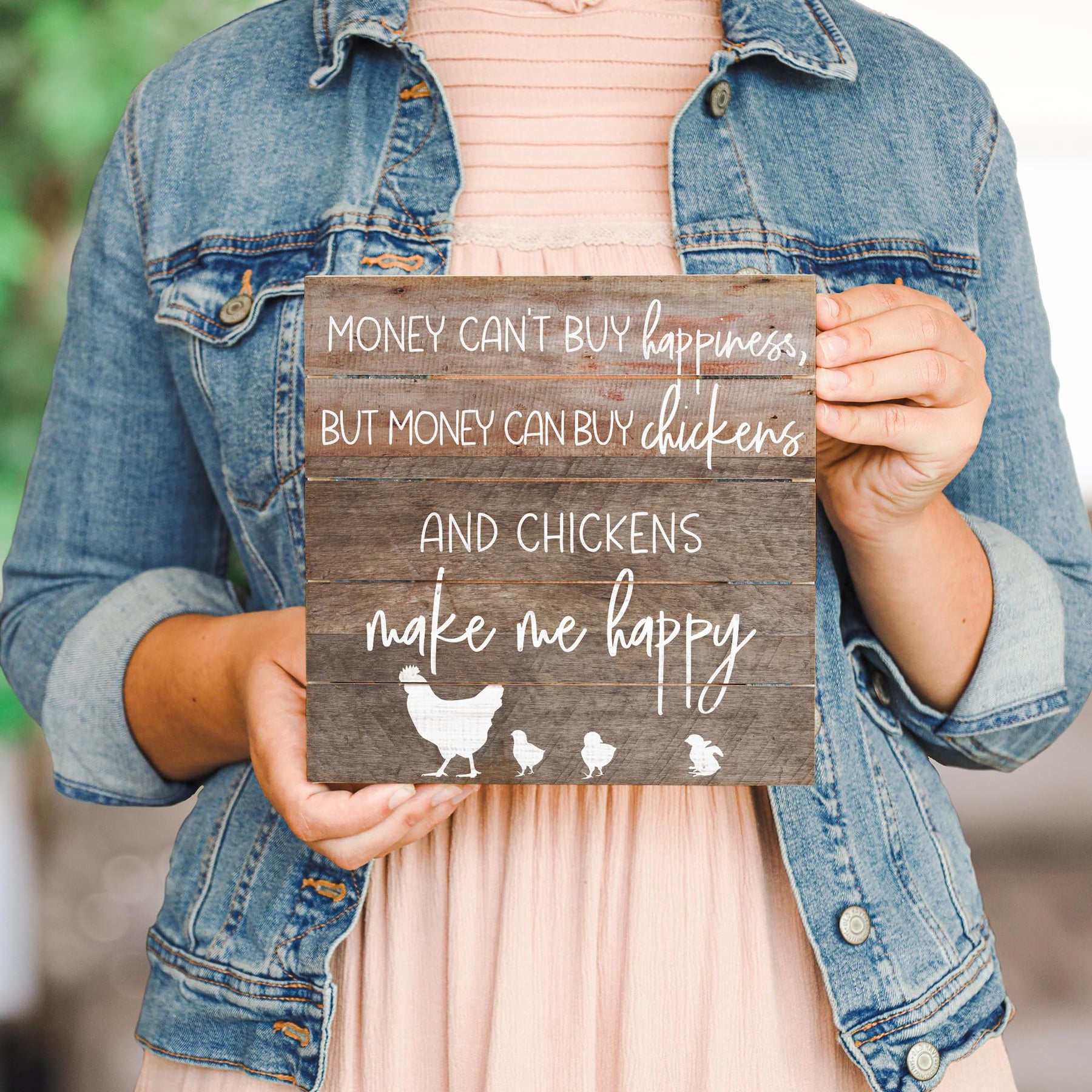 - Rustic sign reads Money can't buy happiness, But money can buy Chickens and Chickens make me happy.