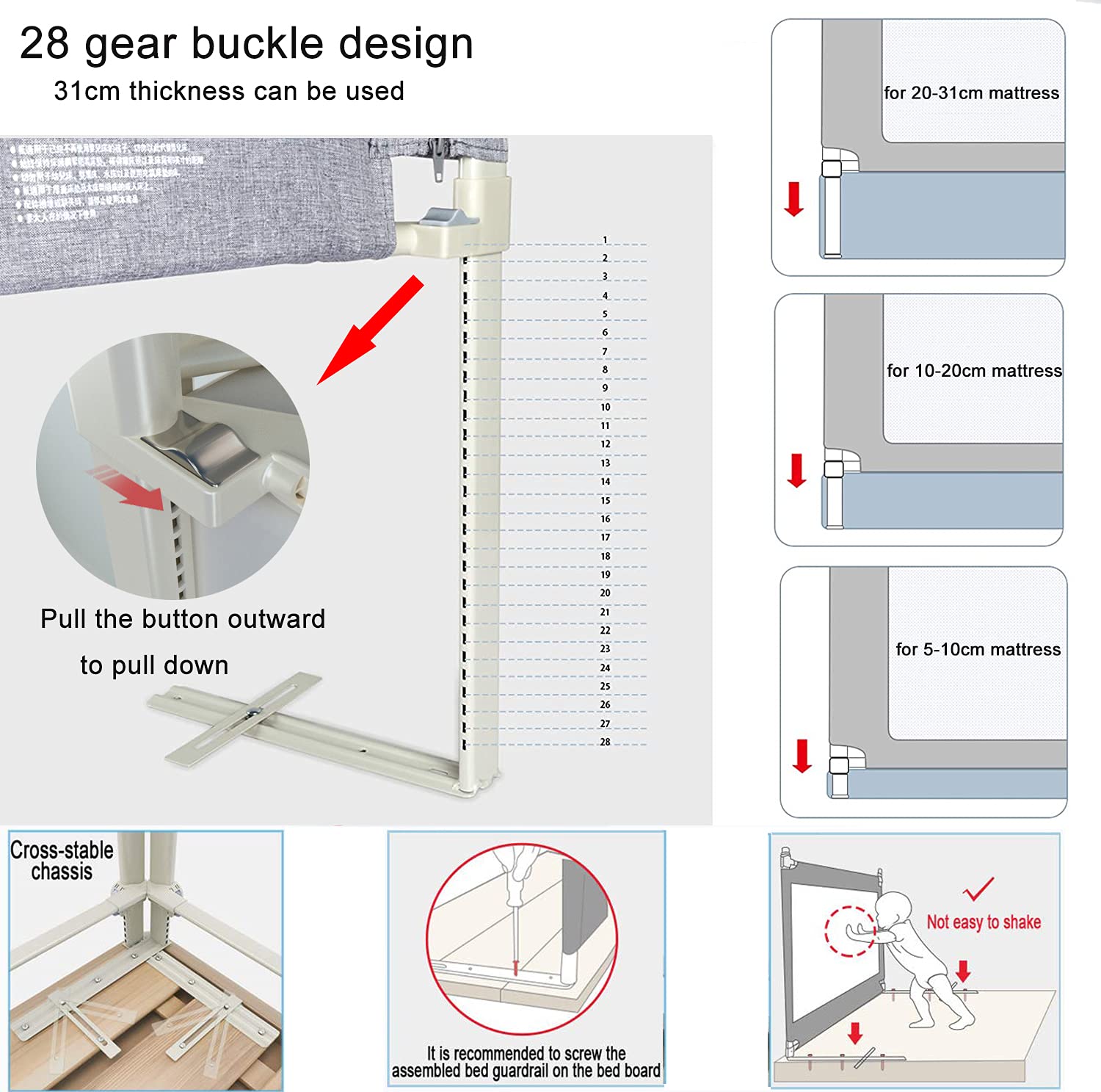 - Specifications: The crib guardrail only includes one side of the bed rail. The height of the guide rail above the bed is 30 inches, and the length is 40/47/59/71/75/79/87 inches, which is suitable for 99% of bed types. The base has a 28-speed snap-in free lift, which can be adjusted from 0 inches to 9 inches to adapt to mattresses of different heights.