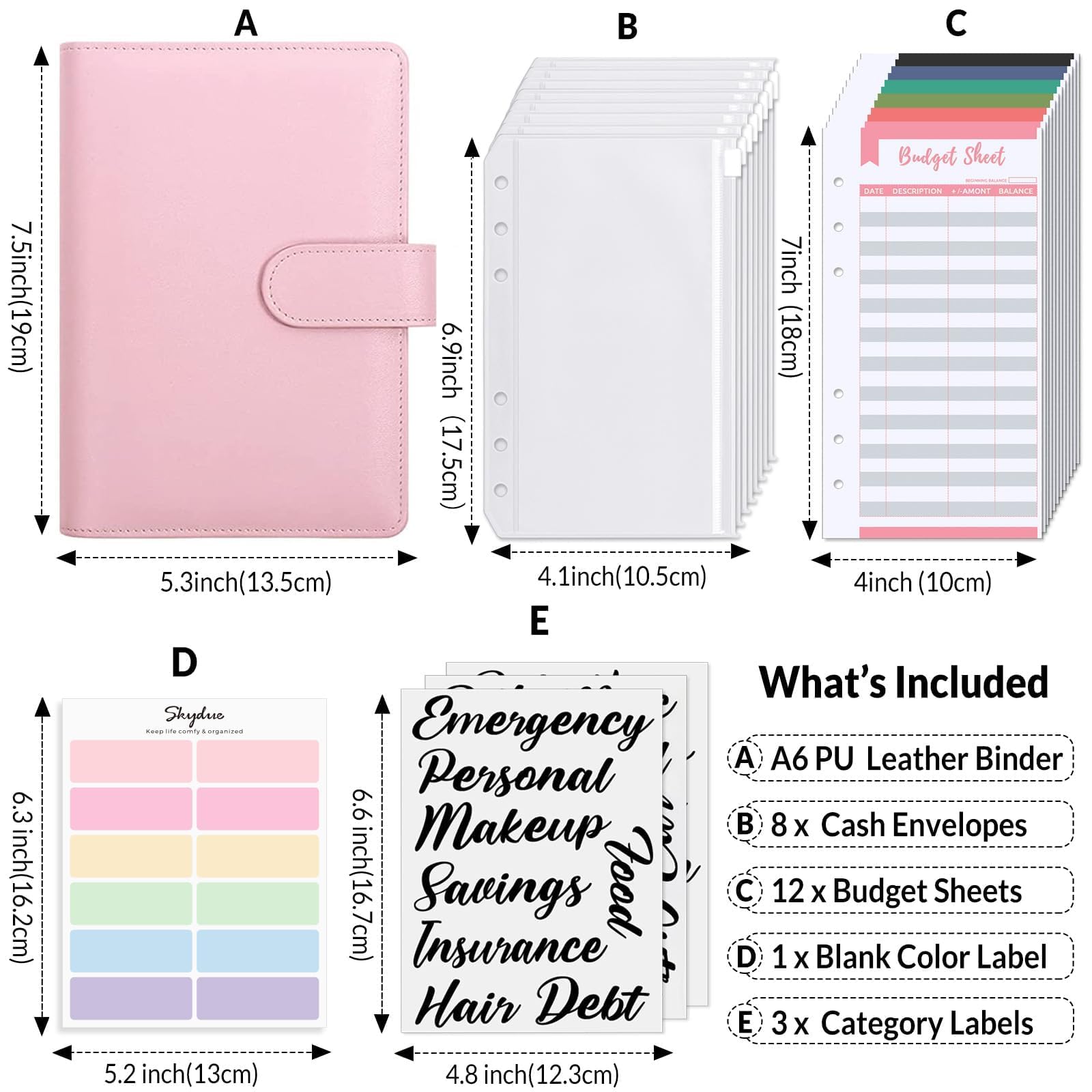 - Cash Envelopes System:1pcs PU leather money saving binder,8pcs A6 6-holes binder pockets,12pcs expense budget sheets,3 sheets of category sticker labels,Budget binder with cash envelopes perfect for you to save money.