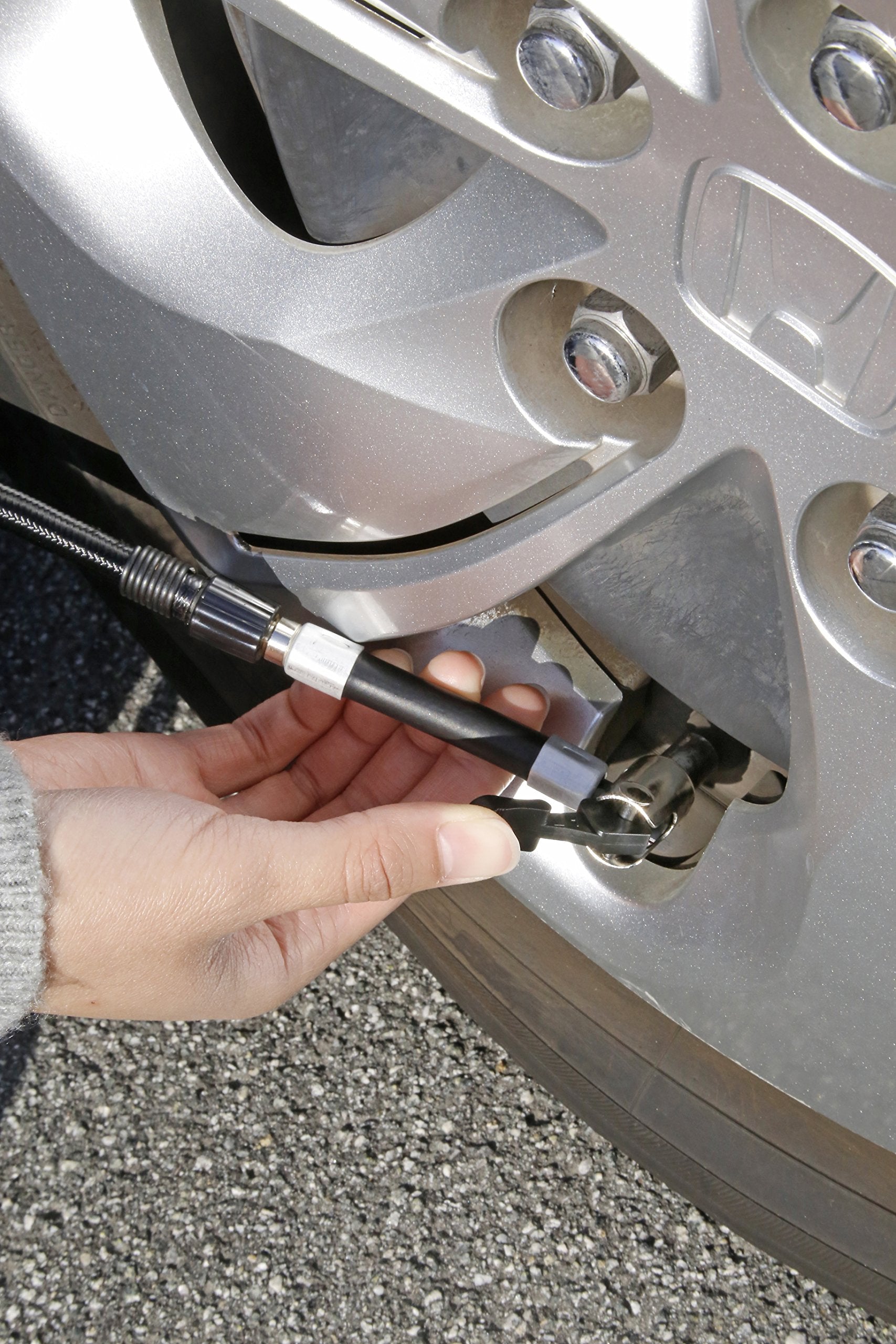 - Simply twist bottom of adapter onto inflator hose; push adapter head onto valve; and press lever down to attach