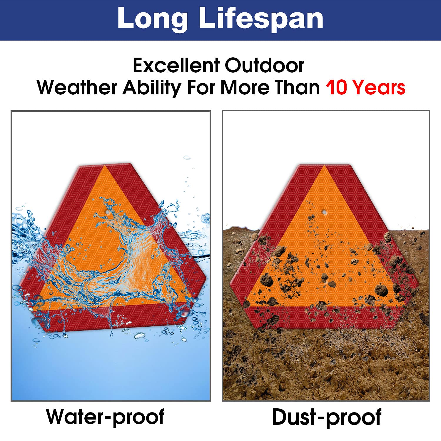 - High Quality: Slow Moving Reflector Sign made of sturdy and strong Engineer Grade Reflective Aluminum. Unlike plastic, Rust Free Aluminum material is Durable, will not bend, warp or crack, is Resistant to inclement weather and Fade-resistant that will last for 7 years.