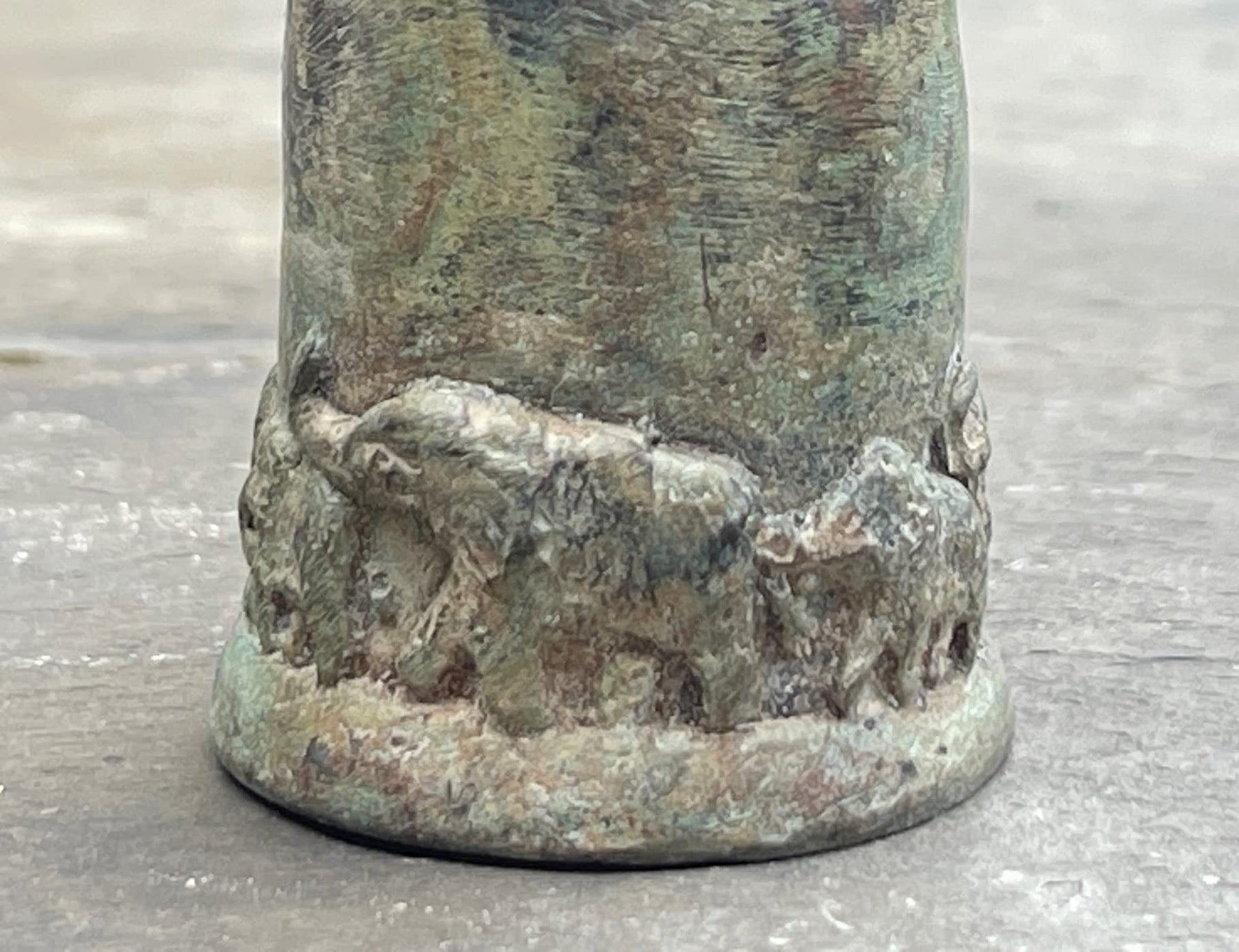 - ANTIQUE STYLE VERDIGRIS GREEN ELEPHANT BELL with additional brown and gray color tones. Color shades will vary and may not be exactly as shown in photo.