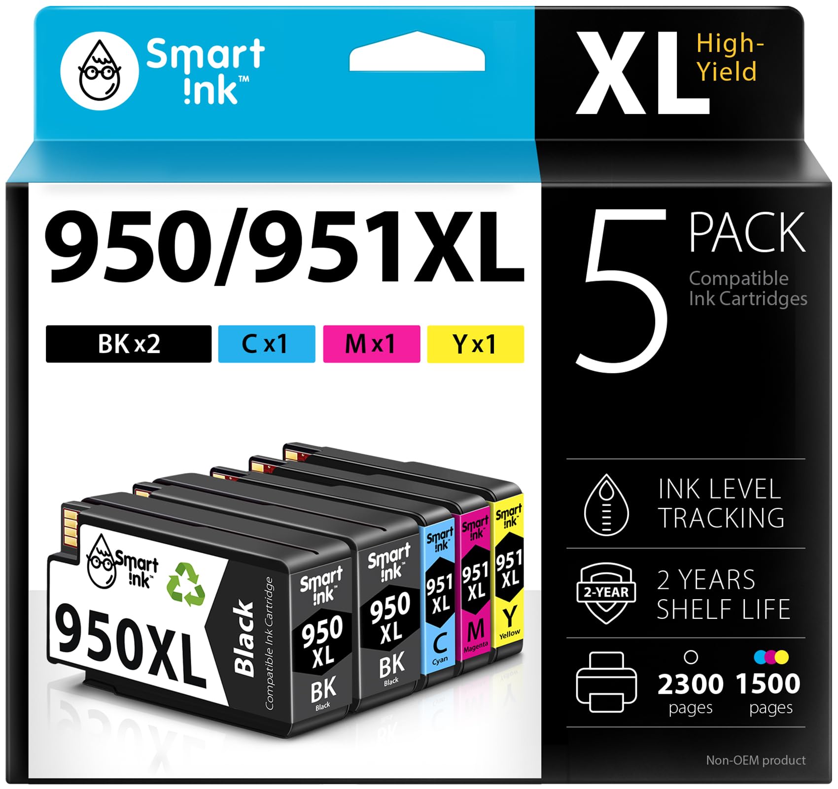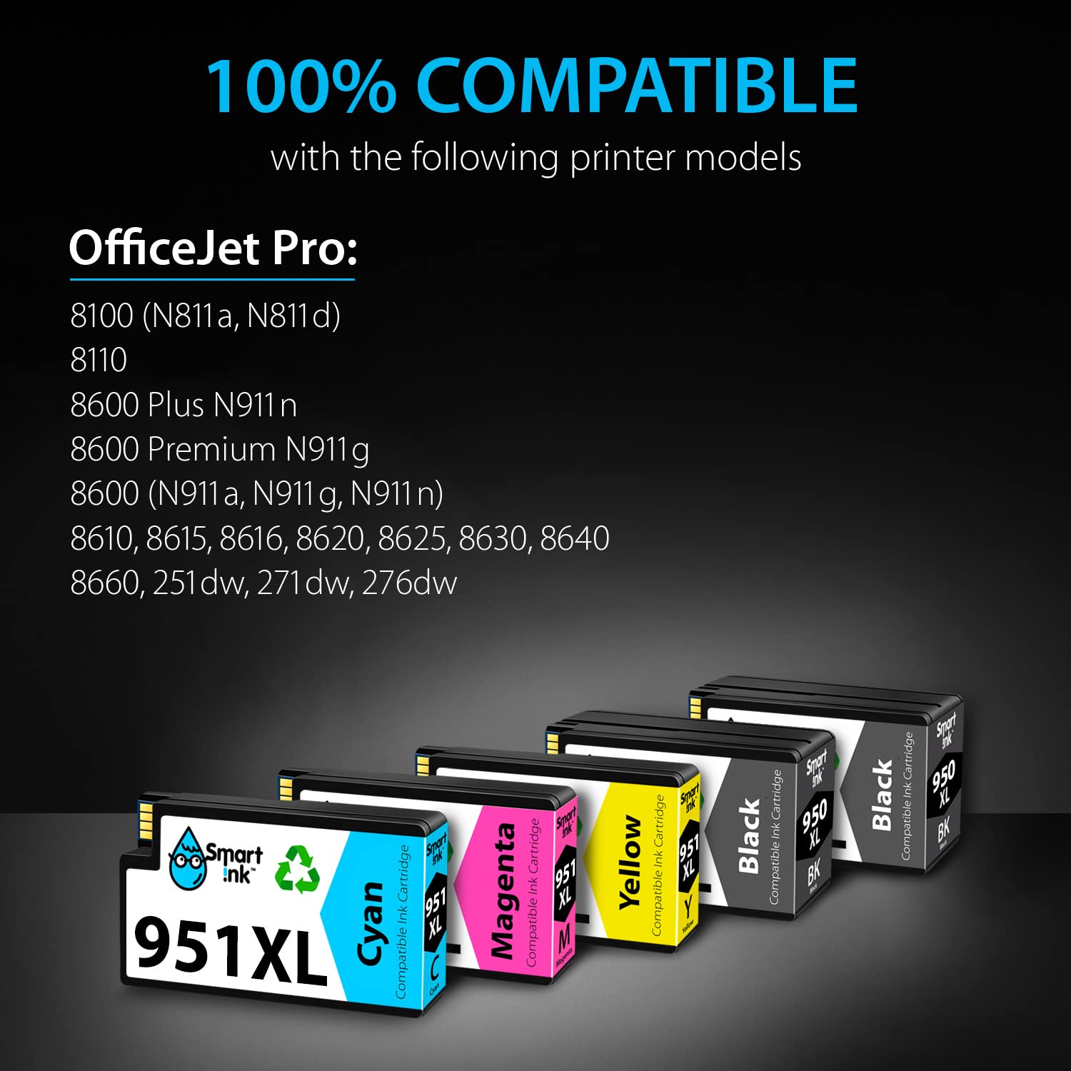 - Original Inkjet Ink Cartridges – Compatible Ink Cartridge Replacement for HP 950XL 951XL 950 XL 951 XL 5 Pack Combo to use with Officejet Pro 8600 plus 8610 8620 8100 8625 8630 Printers (2 Black & 1 Cyan 1 Magenta 1 Yellow) by Smart Ink