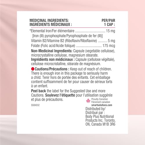 | ingredients | EACH CAPSULE CONTAINS : Elemental Iron (Iron pyrophosphate, Lipsome) 15 mg Vitamin B2 (Riboflavin) 5 mg Folic Acid (Folate) 175 mcg This product does not contain artificial preservatives, colors or sweeteners; no corn, dairy, soy, wheat, gluten or yeast. GLUTEN-FREE. |