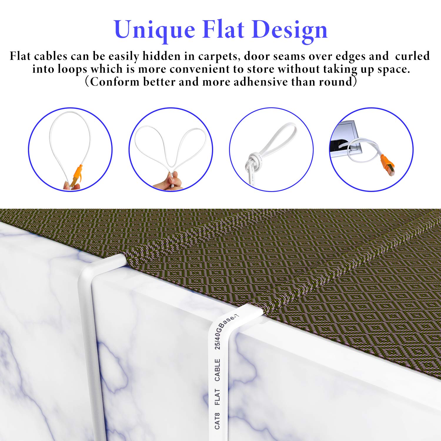 - Space Saving: Cat 8 RJ45 cable adopts optimized flat shape design, easy to install, more flexible and perfectly fit the corner, it can be easily hidden in the carpet, door cracks and other places, more space saving. If you don't need the whole length, you can easily roll it into a loop, effectively avoiding tangles. Our lan cable provides optimal EMI/RFI interference protection and long-distance data transmission to better protect signal quality