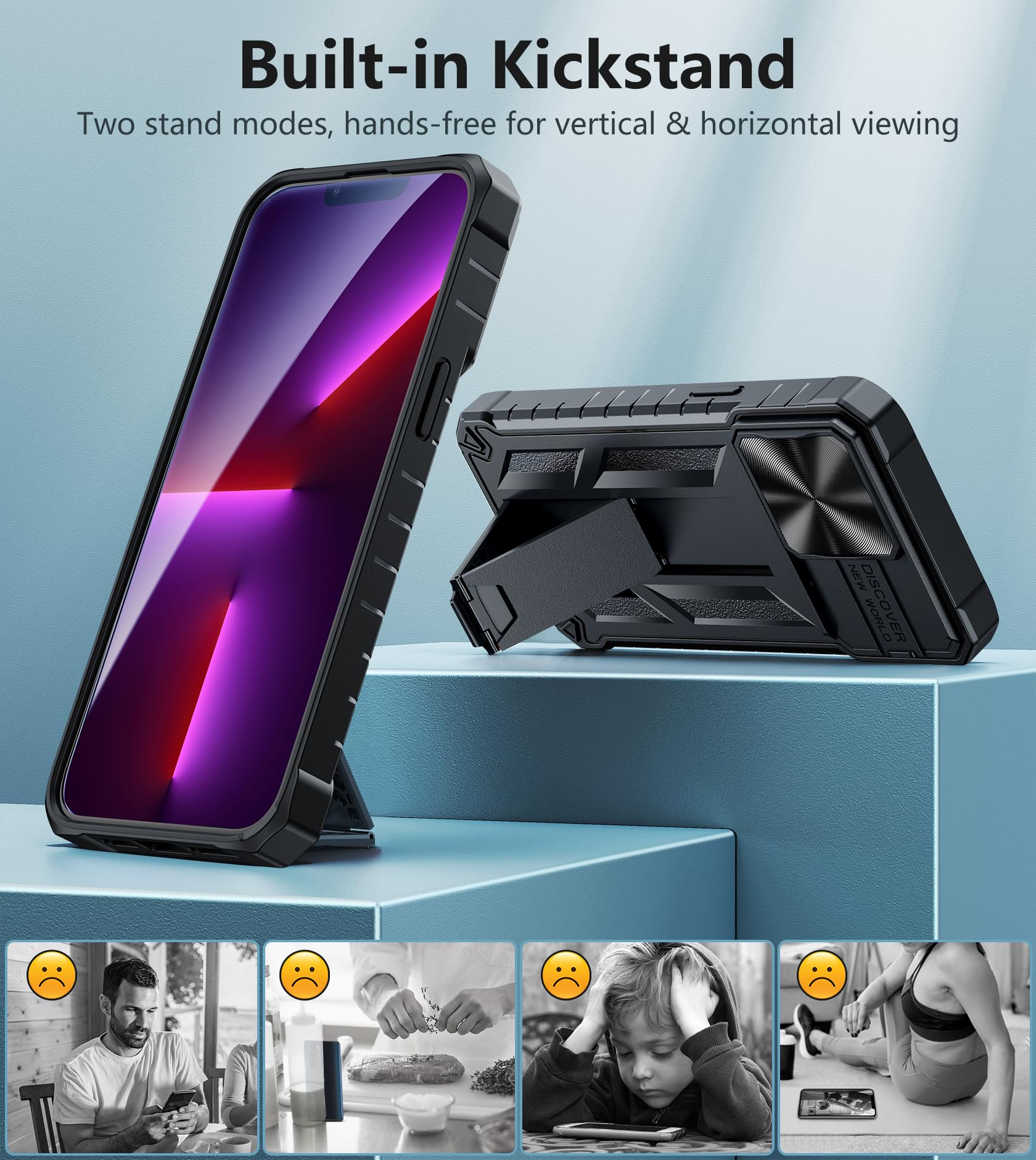 - Built-in Kickstand: This iPhone 13 Pro Max case with hidden stand works perfectly both in vertical and horizontal stable stand angles.Convenient for reading,watching movies,playing games and face-time with your friends.Provides hands-free portrait and landscape viewing angles
