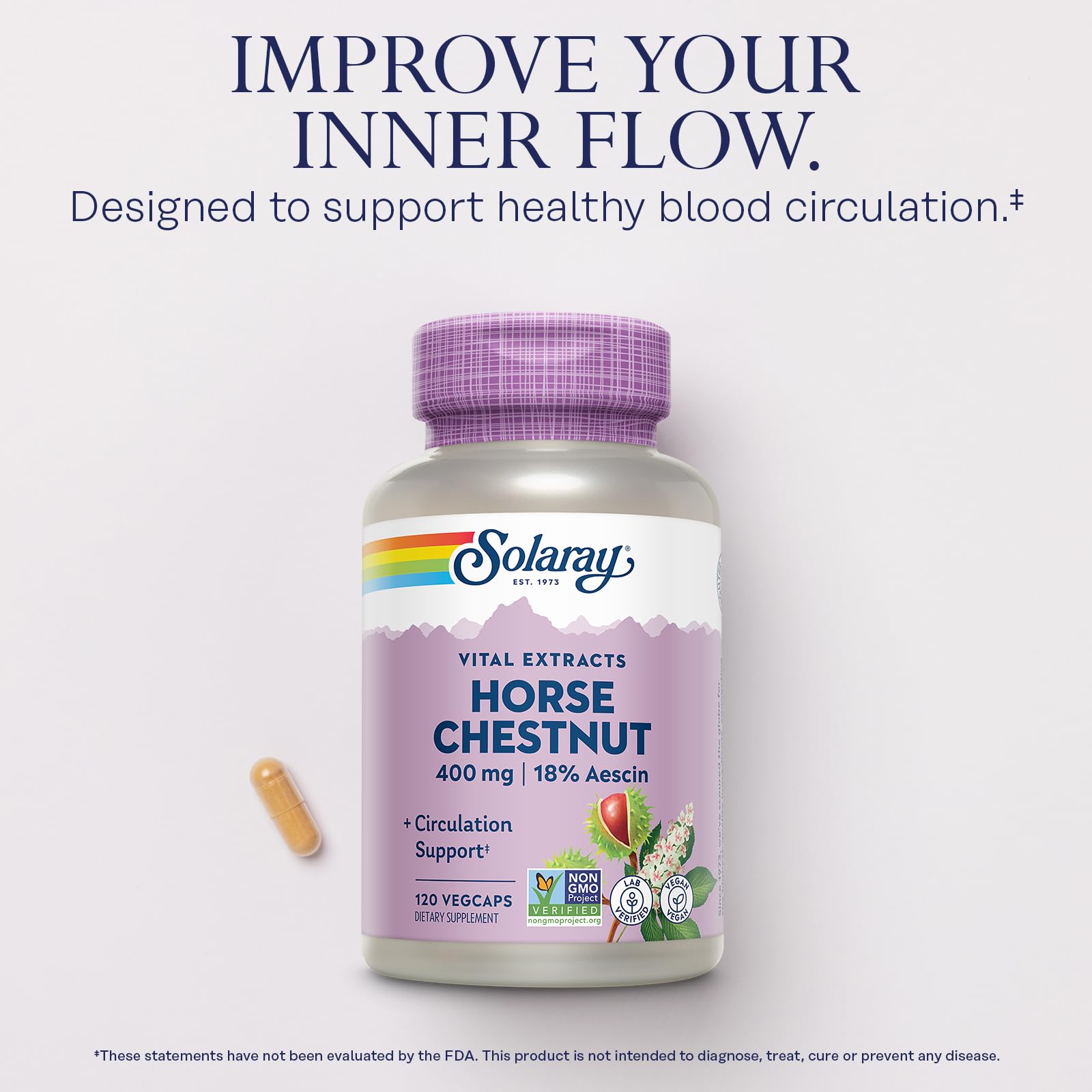 - Original Blended Vitamin & Mineral Supplements – Horse Chestnut Extract 400 mg - Standardized to 72 mg Aescin - with 55 mg of Butchers Broom - Vein and Blood Circulation Supplements - Vegan, Non-GMO, 60-Day Guarantee, 120 Serv, 120 VegCaps by SOLARAY